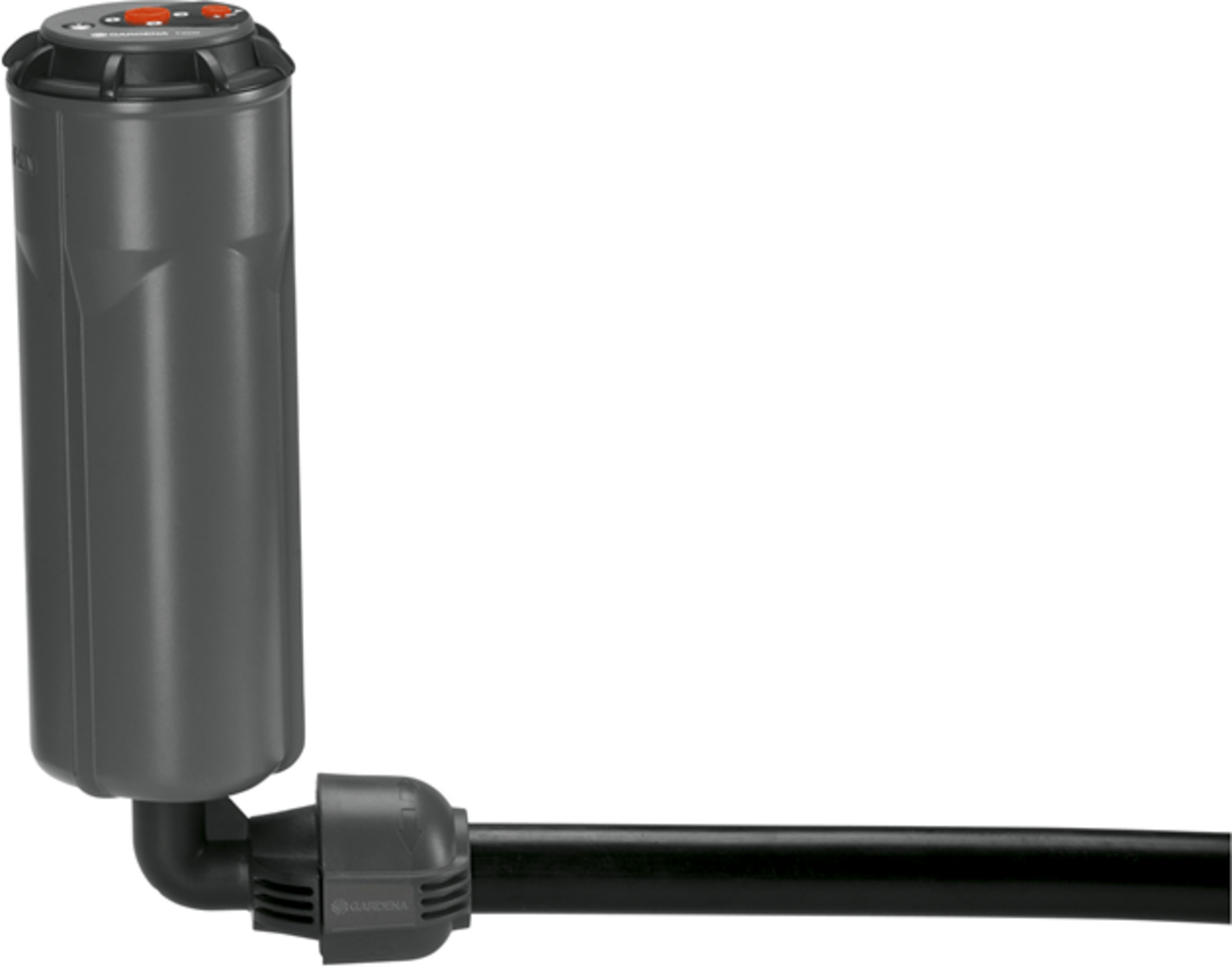 A peça em L 25 mm x 1/2"-rosca externa da GARDENA é o acessório ideal para a ligação aos aspersores de turbina escamoteáveis T 100 e T 200 na extremidade do tubo.
