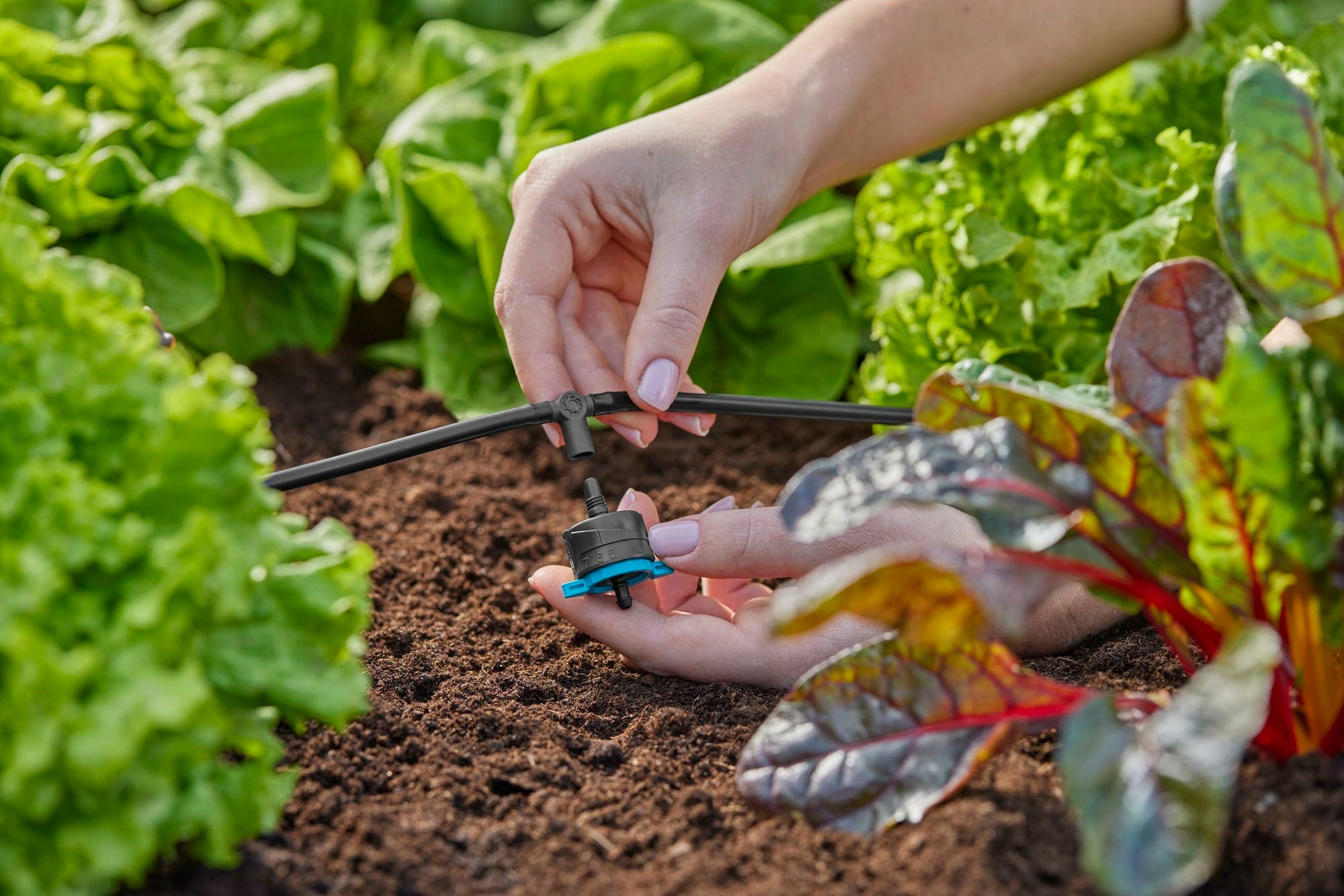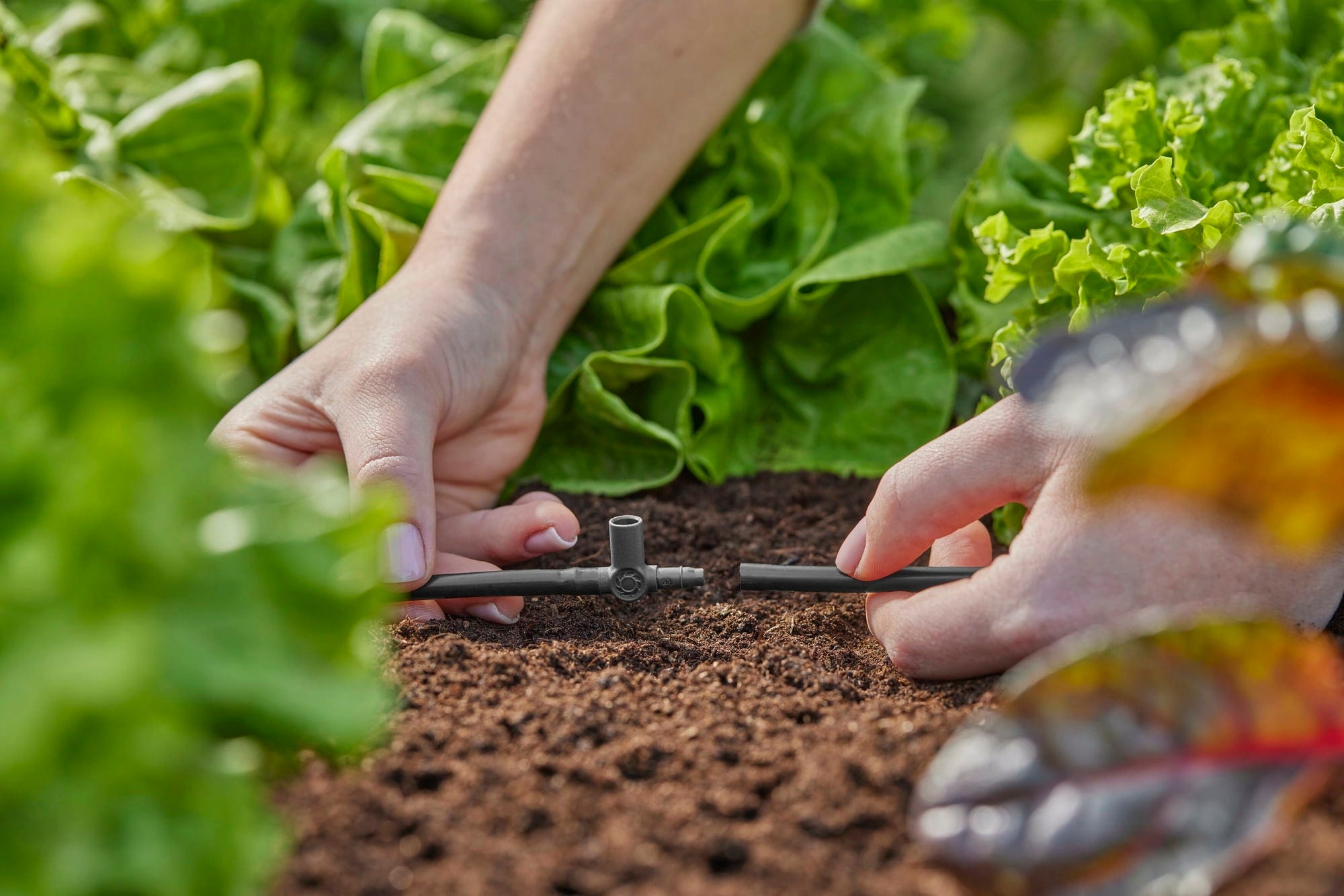 O Micro-Drip-System Peça em T é a solução ideal para montar bicos de pulverização e gotejadores de fim de linha no tubo de distribuição de 4,6 mm. As peças em T contêm duas entradas e saídas para o tubo de distribuição e um dispositivo para enroscar um bico de pulverização. Também é possível a conversão de um gotejador de fim de linha num gotejador em linha.