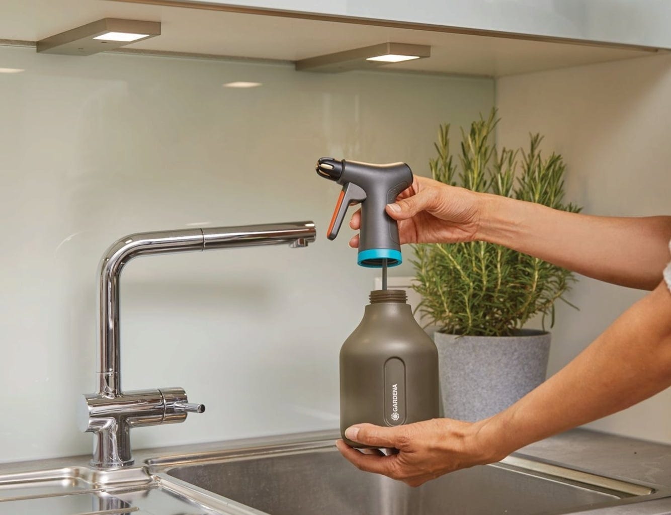 - Graças a uma mangueira de silicone especial com peso, não é aspirado ar e o pulverizador funciona mesmo numa posição inclinada