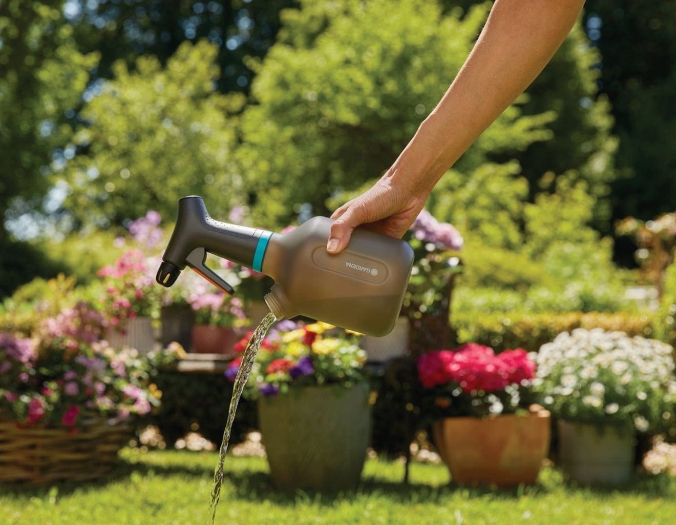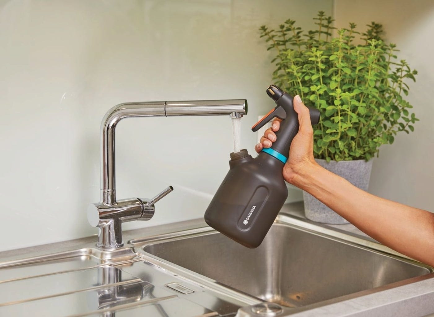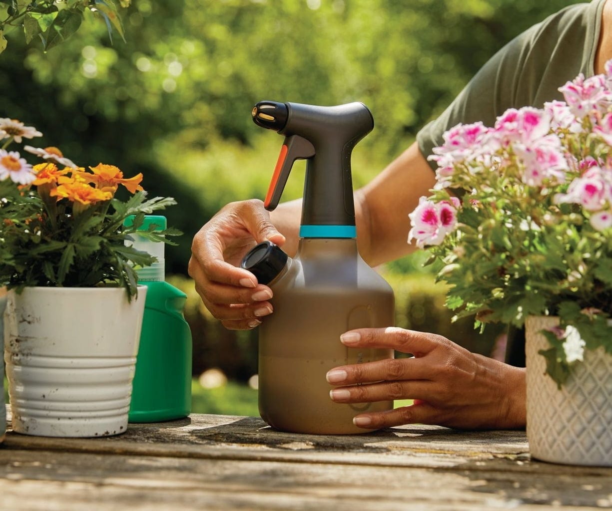 Ideal para a pulverização suave de flores em casa, no terraço ou no jardim. Este pulverizador de pressão com capacidade de 1 litro tem tudo o que precisa: é feito de plástico translúcido. Uma segunda abertura permite o enchimento, a mistura e o esvaziamento fáceis. A tampa serve como tampa doseadora para fertilizantes ou produtos fitofarmacêuticos. Uma mangueira de silicone especial com peso evita a aspiração de ar, permitindo que o pulverizador funcione mesmo em posição inclinada. Simplesmente genial.