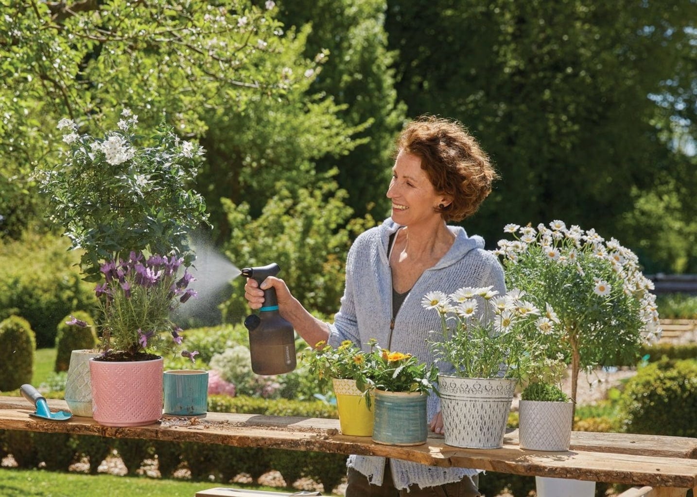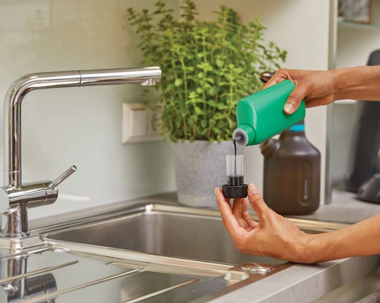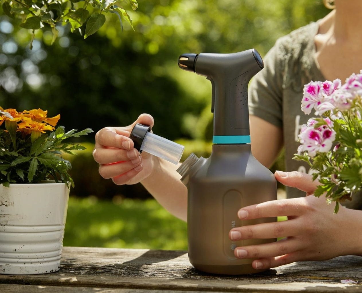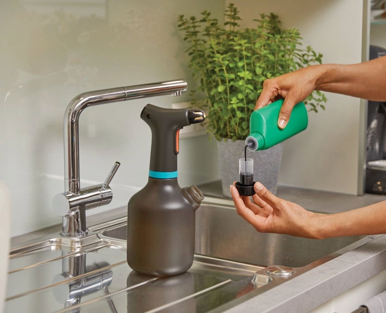 Ideal para a pulverização suave de flores em casa, no terraço ou no jardim. Este pulverizador de pressão com 1 litro de capacidade tem tudo o que precisa: graças ao funcionamento a pilhas, a pulverização é possível com o premir de um botão, sem necessidade de bombear. É fabricado em plástico translúcido. Uma segunda abertura permite encher, misturar e esvaziar facilmente. A tampa serve como copo doseador para fertilizantes ou produtos fitofarmacêuticos. Uma mangueira de silicone especial com peso evita a aspiração de ar, permitindo que o pulverizador funcione mesmo em posição inclinada. Simplesmente genial.