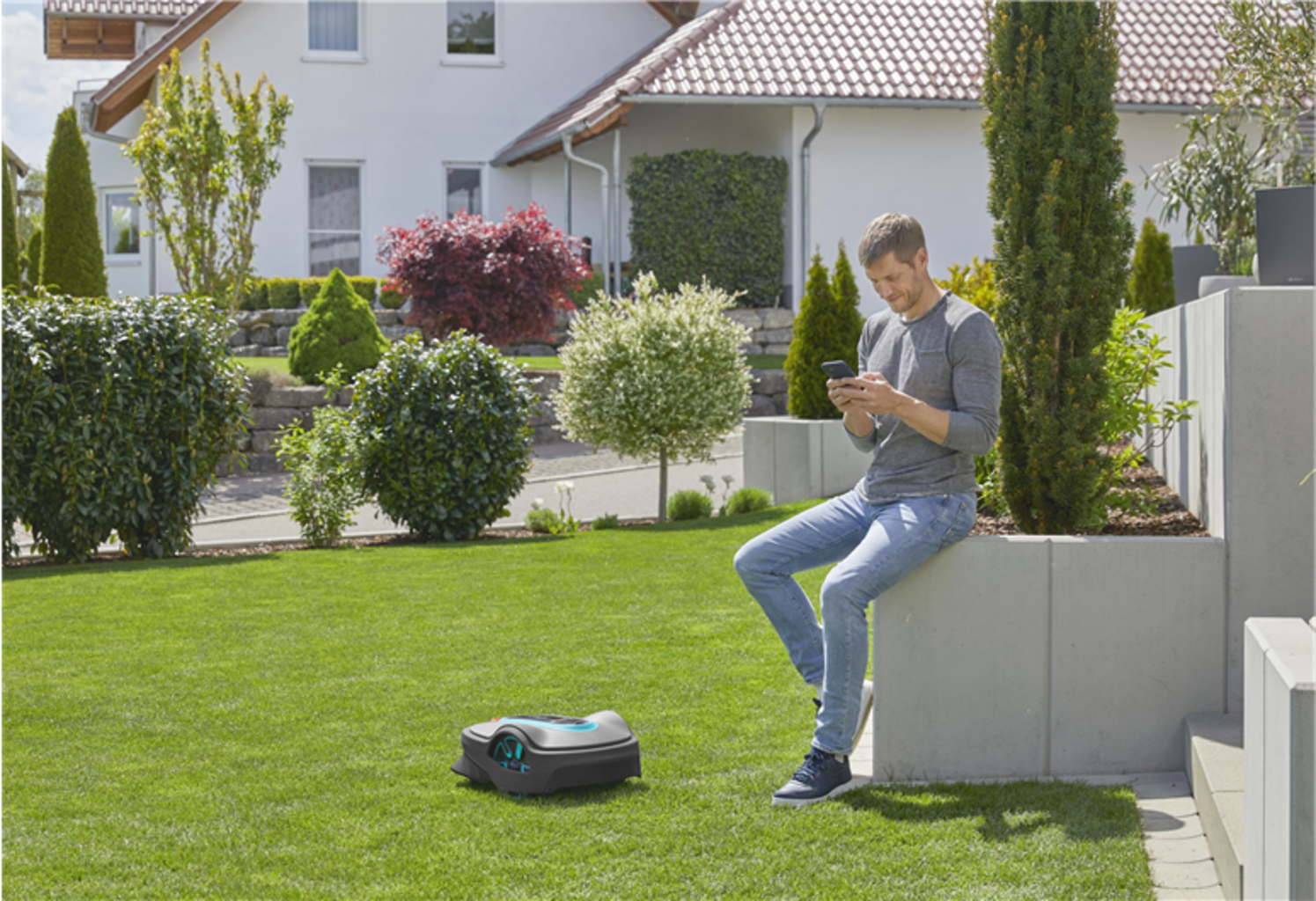 • Controlo flexível via app: Com a app smart gratuita, pode controlar a manutenção do seu jardim a partir de qualquer lugar – seja em casa ou até mesmo de férias. Cortar a relva, regar e muito mais podem ser controlados comodamente via smartphone.