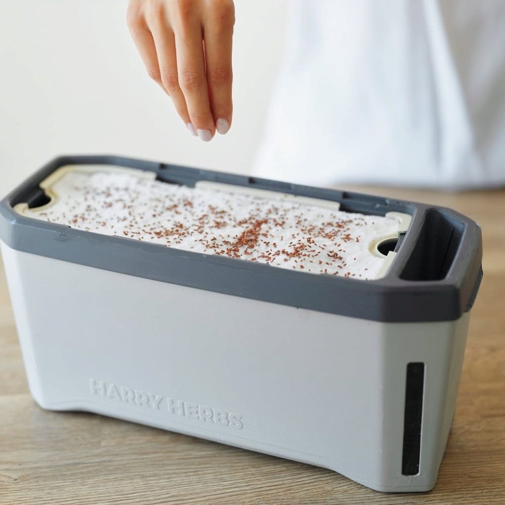 A esteira de cultivo premium é um acessório especialmente prático para o vaso de ervas HARRY HERBS. No cultivo de ervas, ajuda a transportar a água do reservatório para a terra e, no cultivo de microgreens, serve diretamente como base para a sementeira.