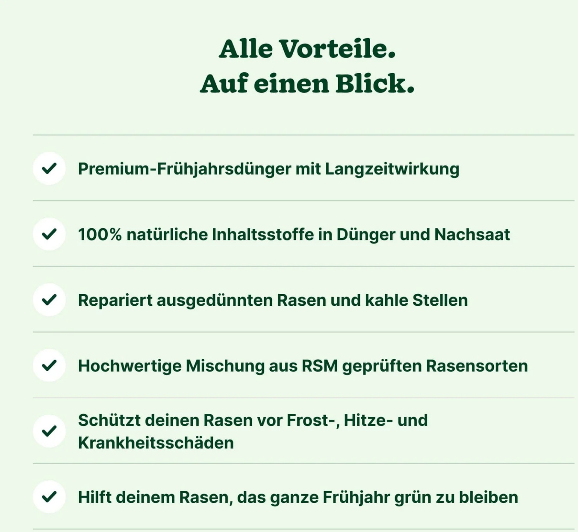 Após os meses frios, o teu relvado precisa de um reforço — e este kit é perfeito para isso. Enquanto o adubo fortalece e nutre o relvado a longo prazo, a ressementeira garante o crescimento de novas áreas densas. Em pouco tempo, terás um relvado resistente, uniforme e de um verde intenso, do qual te podes orgulhar.