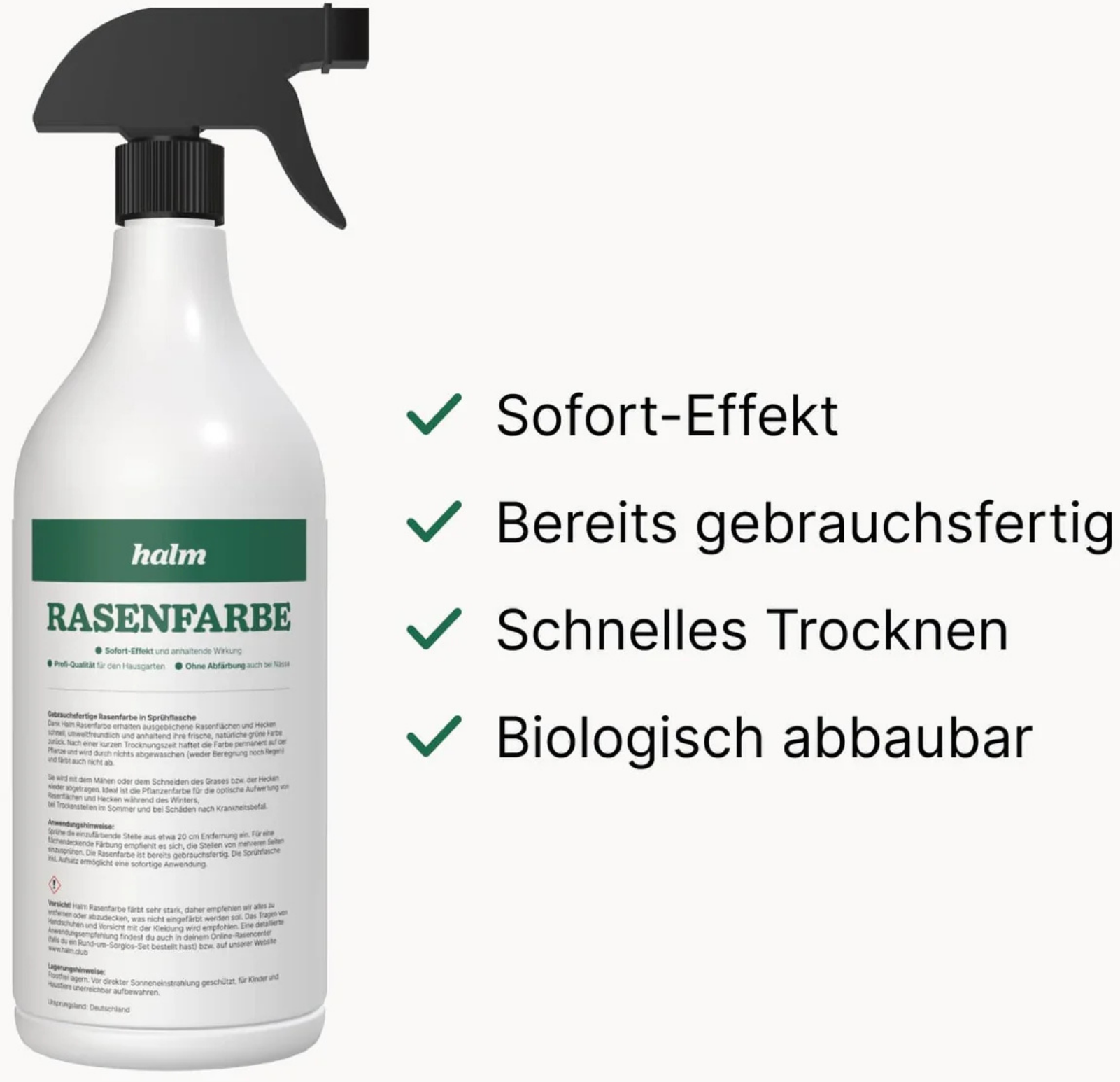 Se o teu relvado parecer pálido ou irregular, não precisas de esperar muito – com a tinta para relvado Halm consegues um verde fresco e intenso num instante. A aplicação é simples e proporciona imediatamente um aspeto cuidado, sem necessidade de longos períodos de regeneração.