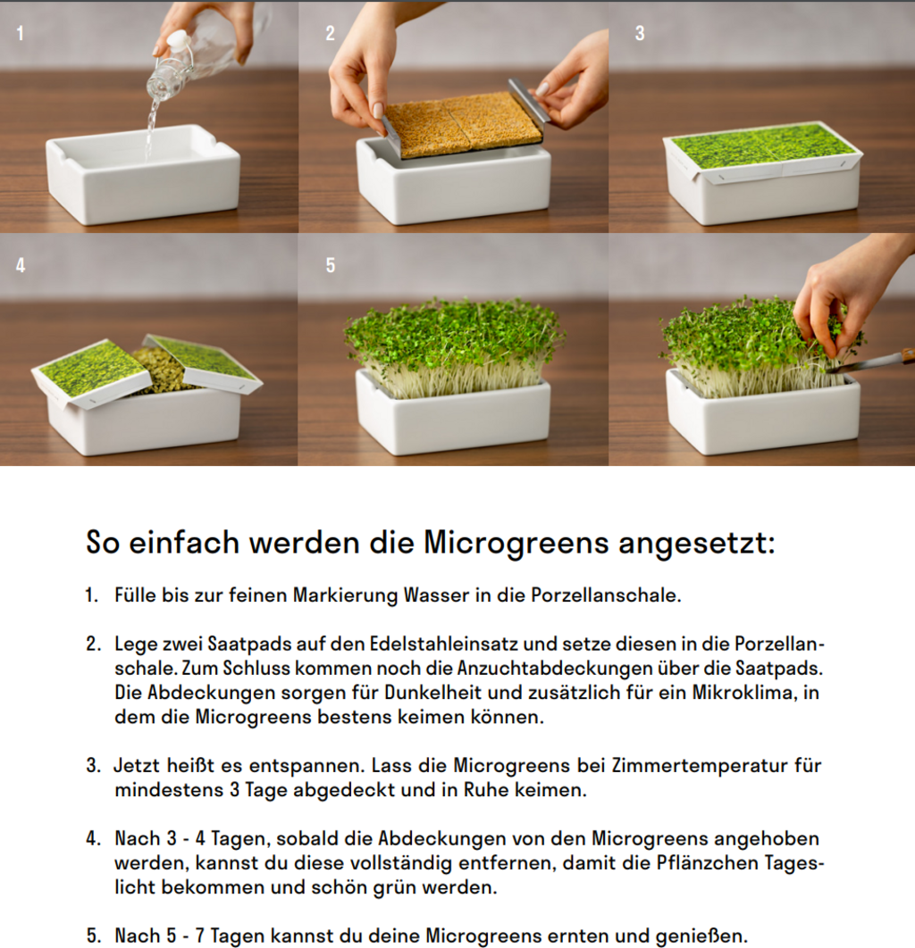 Atenção: Uma vez que os Microgreens não são rebentos, mas sim jovens plantas germinadas, apenas a parte acima da raiz é adequada para consumo.