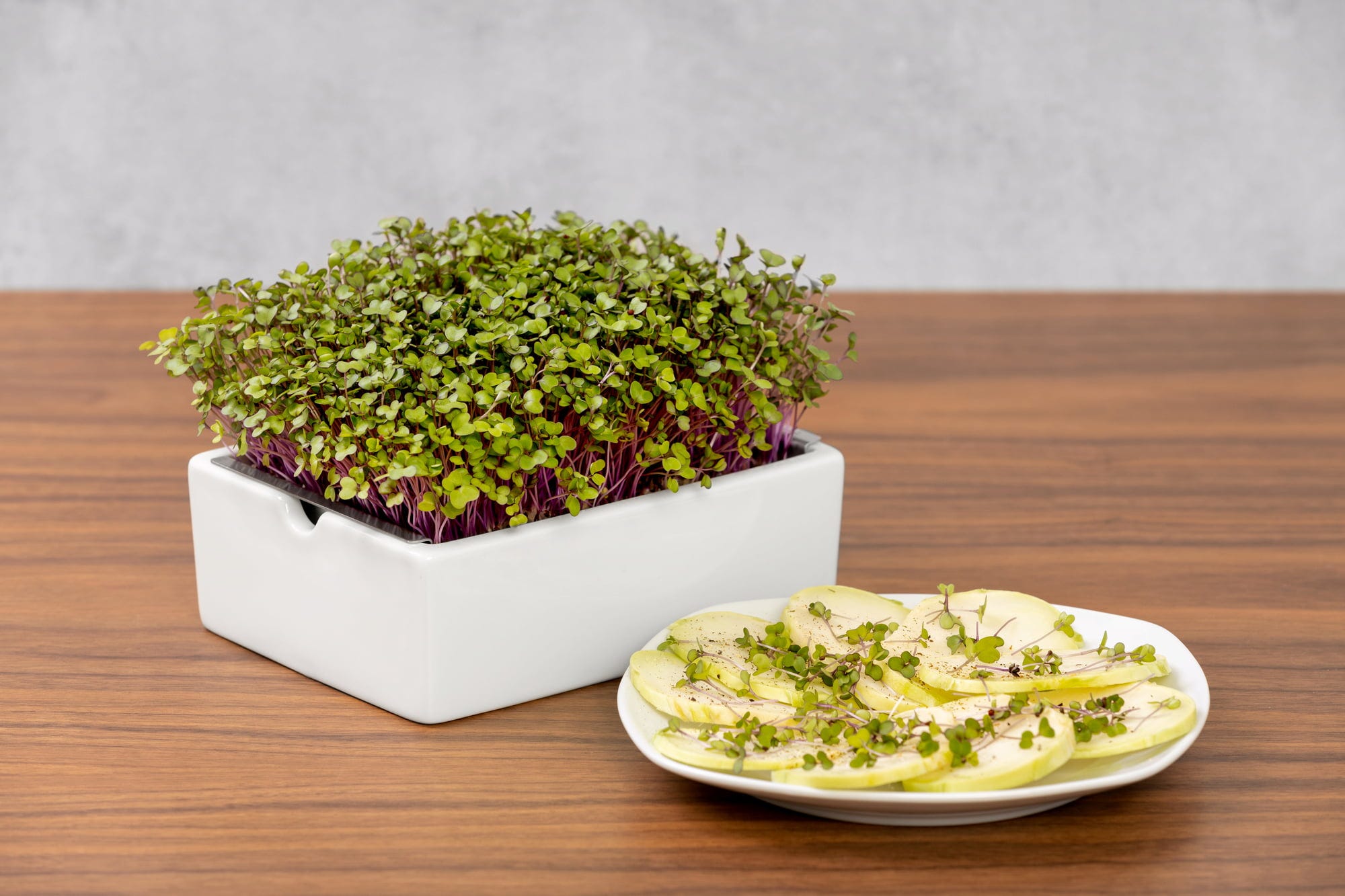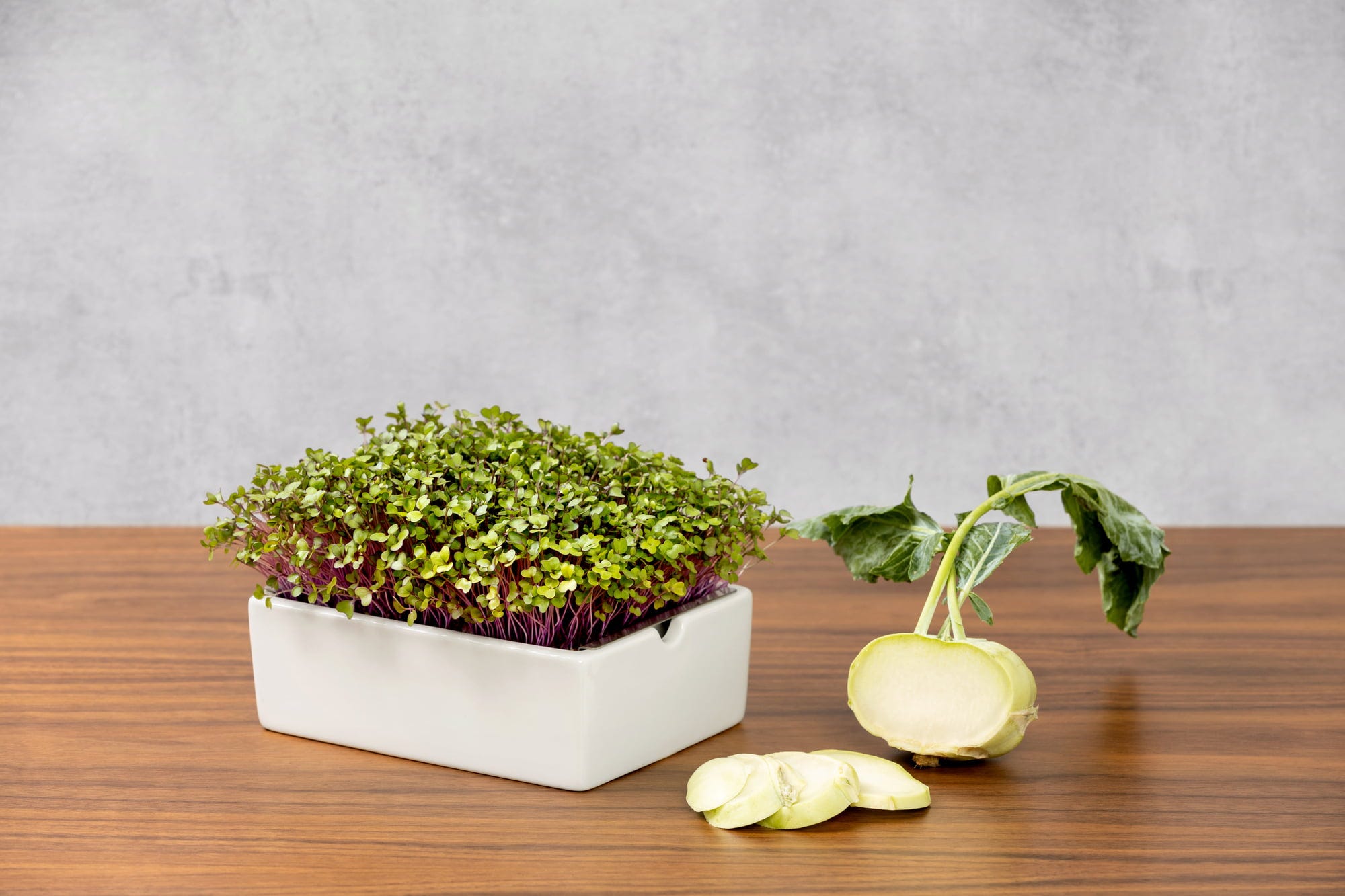 Os maravilhosos Microgreens de couve-rábano têm um aroma intensamente fresco, típico de couve, e trazem variedade ao prato. As delicadas plantas germinadas de cor rosa são uma bonita decoração e um ingrediente saboroso. Perfeitas para refinar tábuas de queijos, saladas, entradas, pratos de legumes, carne e peixe.