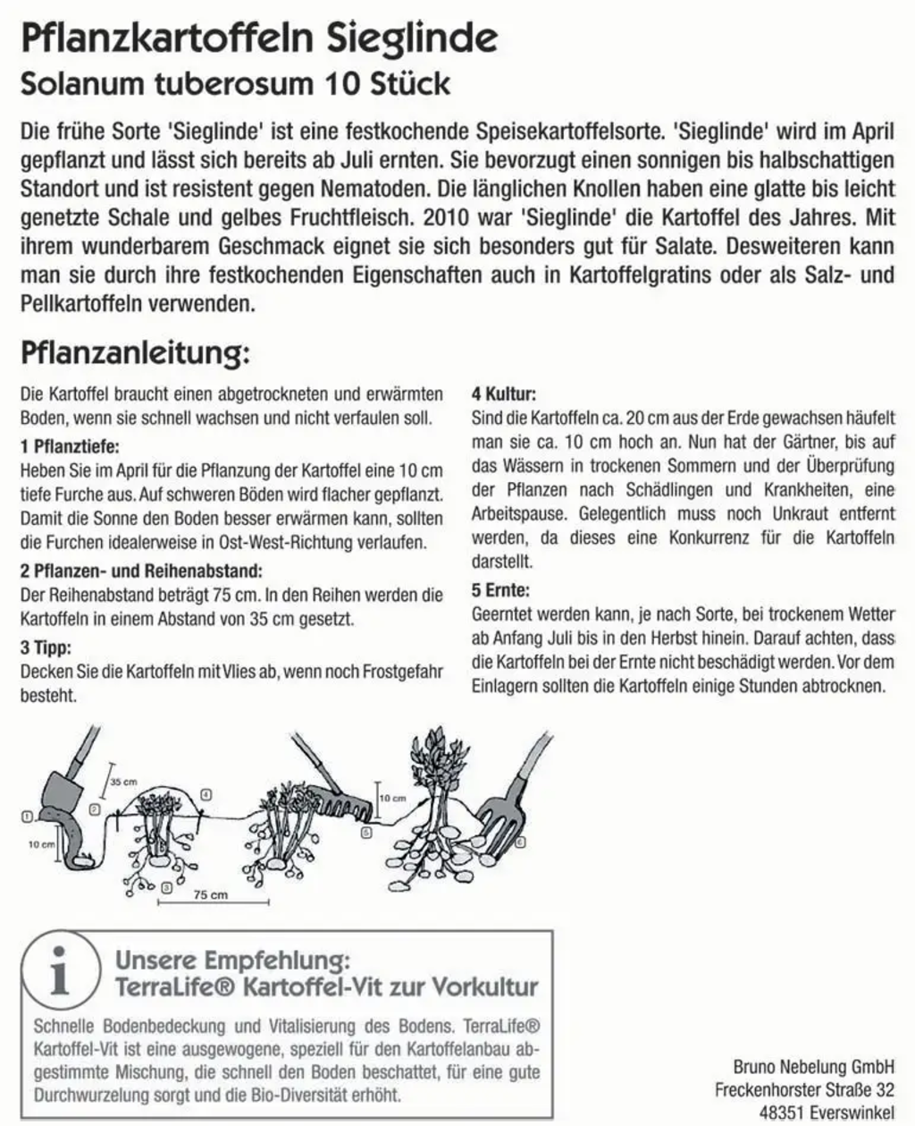 A batata "Sieglinde" não exige condições especiais de solo ou de abastecimento de água. Uma boa capacidade de armazenamento, um sabor fino e aromático, ligeiramente untuoso, bem como a resistência aos nemátodos, caracterizam esta maravilhosa batata.