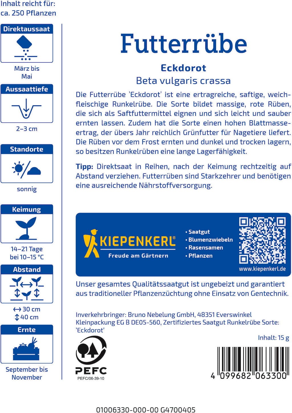 Esta beterraba forrageira produtiva, suculenta e de forma cilíndrica produz beterrabas volumosas que podem ser colhidas de forma fácil e limpa. São adequadas como alimento suculento e têm também um elevado rendimento de massa foliar, para que receba simultaneamente muita forragem verde para roedores.