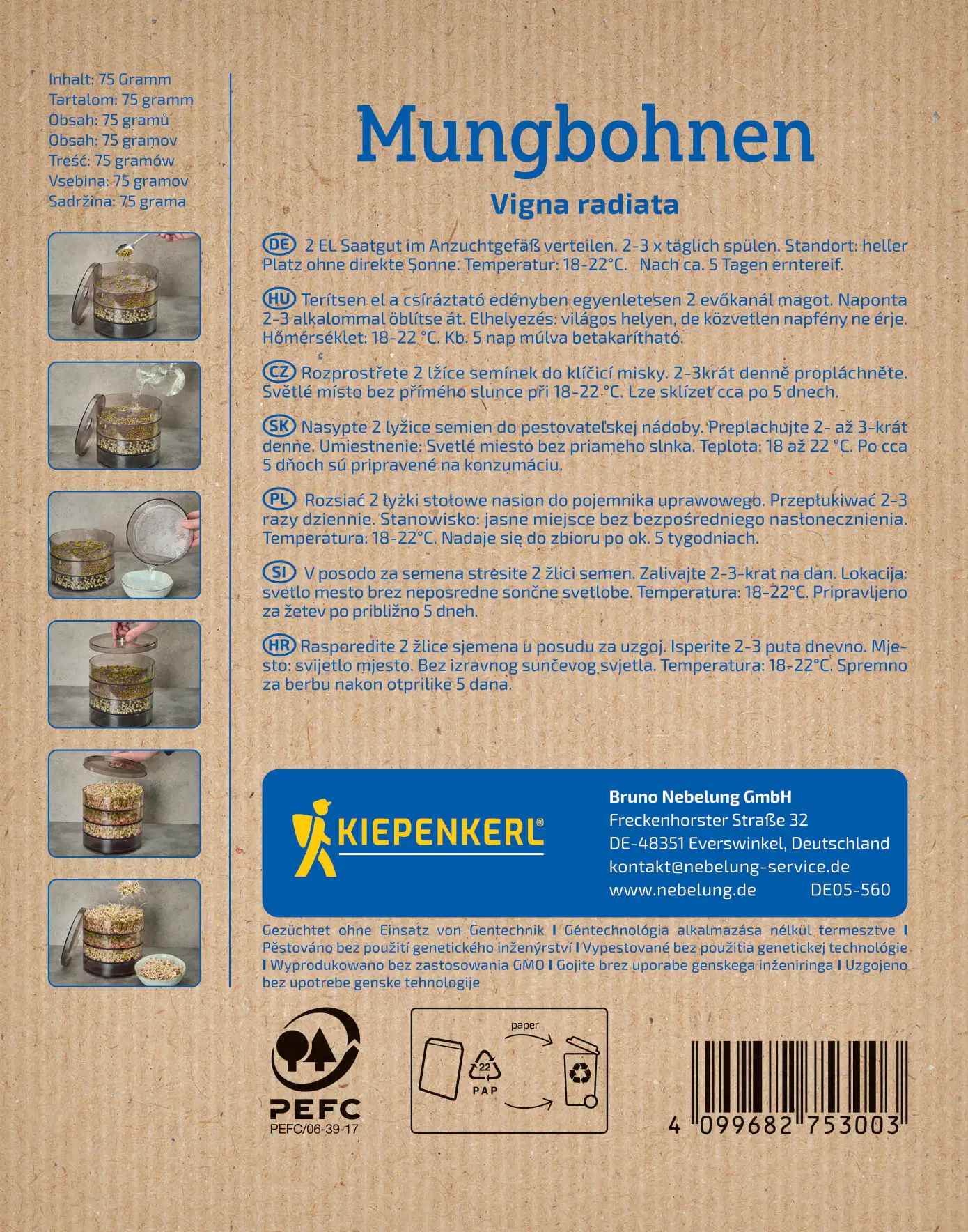 Os brotos de feijão mungo têm um sabor ligeiramente adocicado e amendoado. Podem ser consumidos crus e combinam bem com pratos doces e salgados. Enxaguar 2 a 3 vezes por dia; após 3 a 5 dias, os brotos estão prontos para consumo. Cultivo recomendado na Kiepenkerl Sprossenbox.