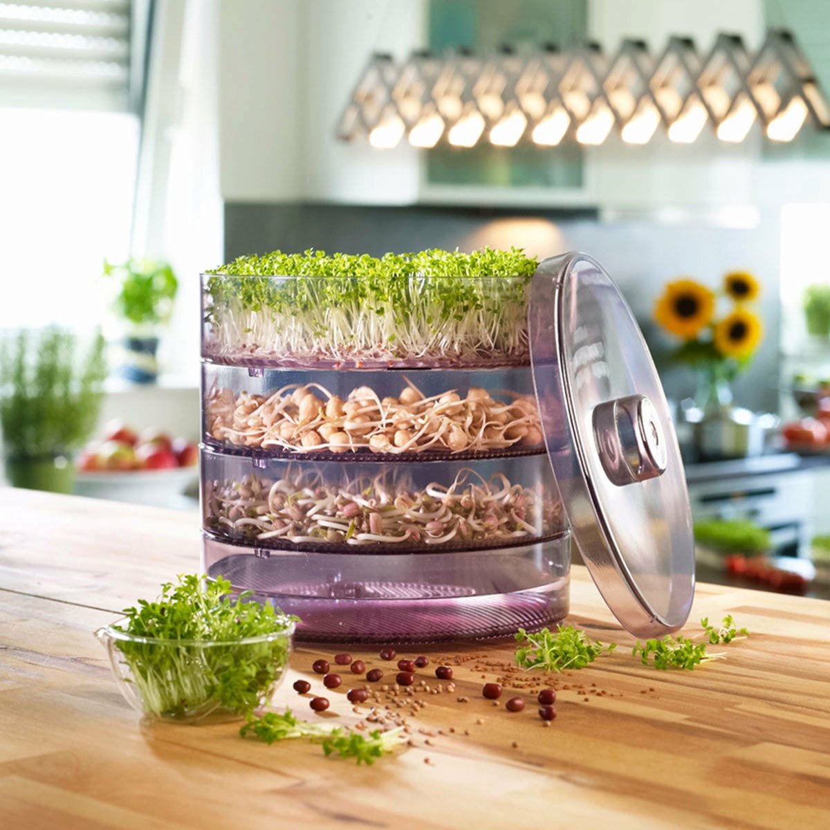 Ao escalonar o início do cultivo dos rebentos, terá sempre rebentos frescos à mão. Os níveis individuais da caixa de germinação também podem ser utilizados para diferentes tipos de rebentos. Desta forma, pode desfrutar constantemente de diferentes sabores do seu próprio cultivo.