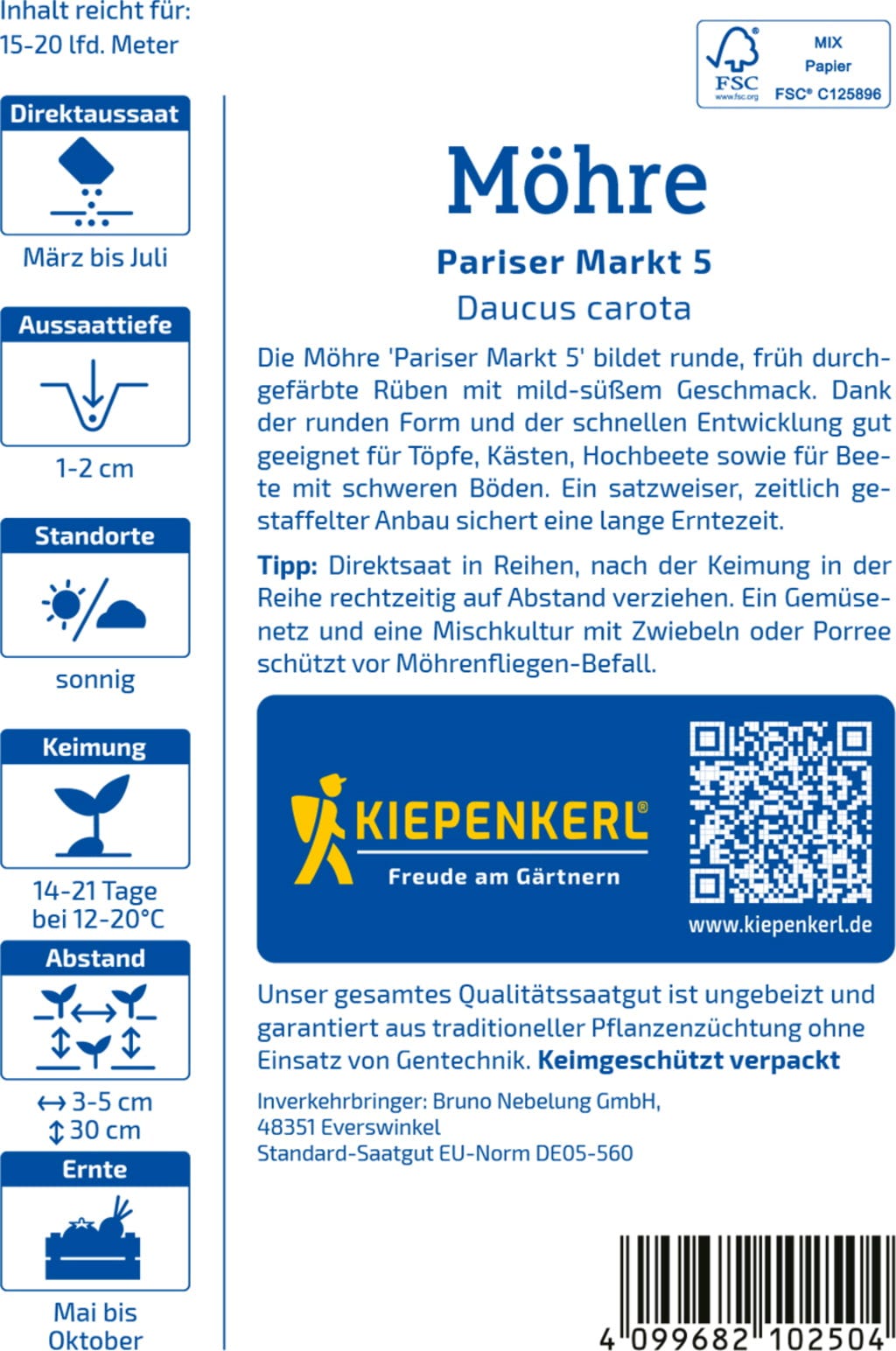 A cenoura Pariser Markt 5 destaca-se pelas suas raízes redondas de maturação precoce e sabor doce e suave. A sua forma compacta e o desenvolvimento rápido tornam-na ideal para o cultivo em vasos, floreiras ou canteiros elevados.
