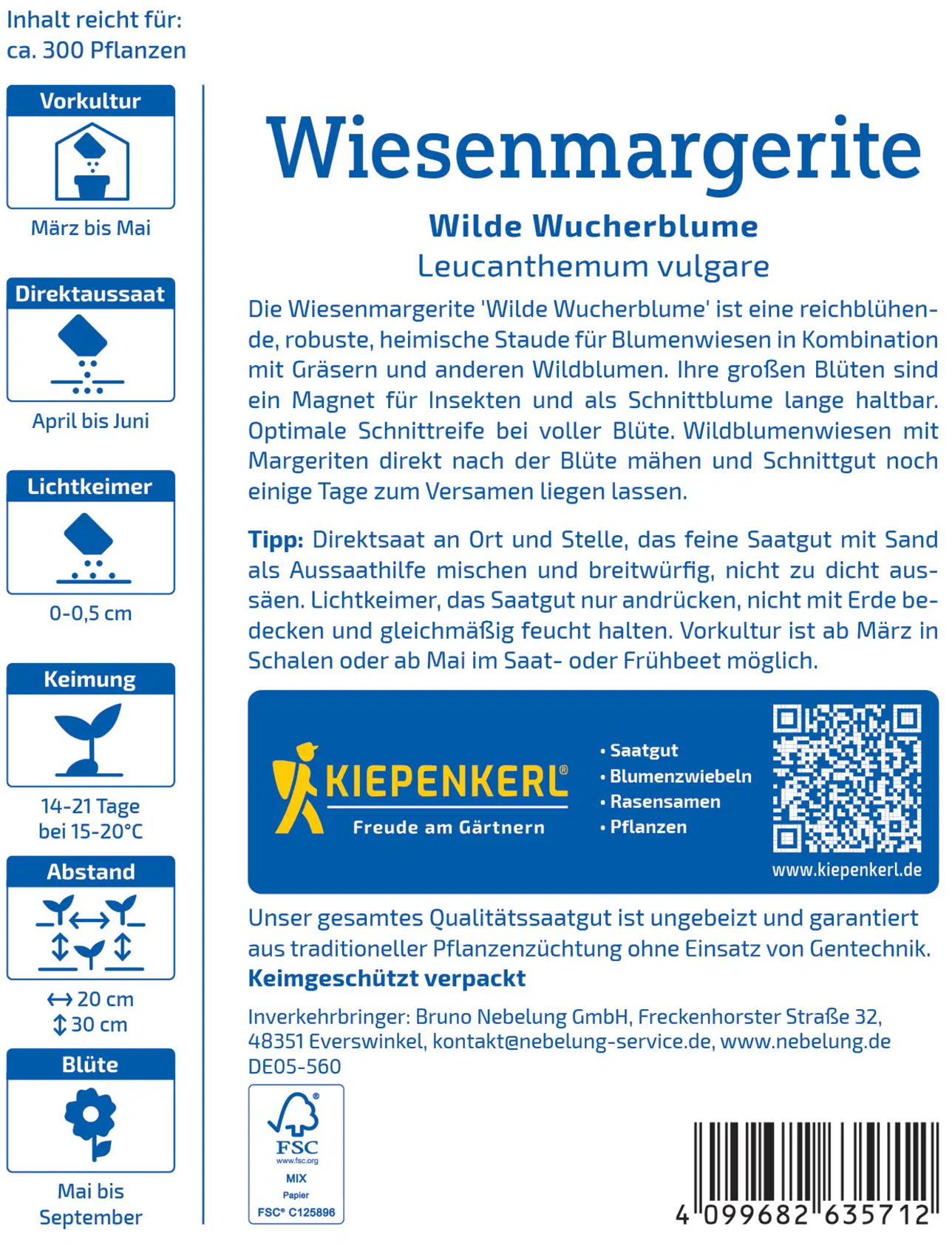A margarida-dos-campos "Wilde Wucherblume" confere ao seu jardim um toque natural e vibrante. É de fácil manutenção, perene e apoia a população local de insetos – perfeita para prados naturais, canteiros ou áreas de flores silvestres. Com as suas flores brancas encantadoras, cria destaques coloridos e garante um paraíso florido cheio de diversidade.