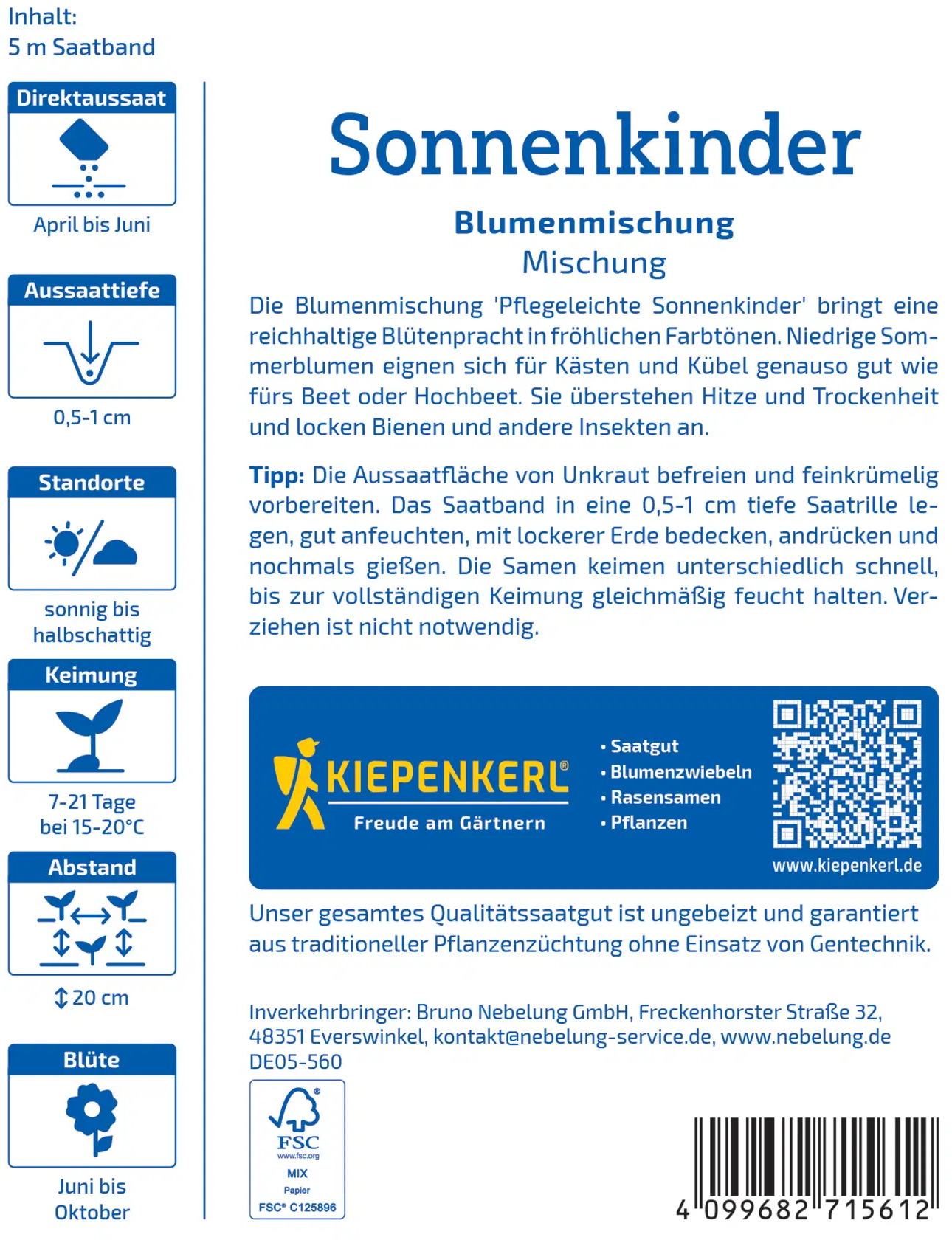 Kiepenkerl Mistura de flores "Crianças do Sol" de fácil manutenção, fita de sementes