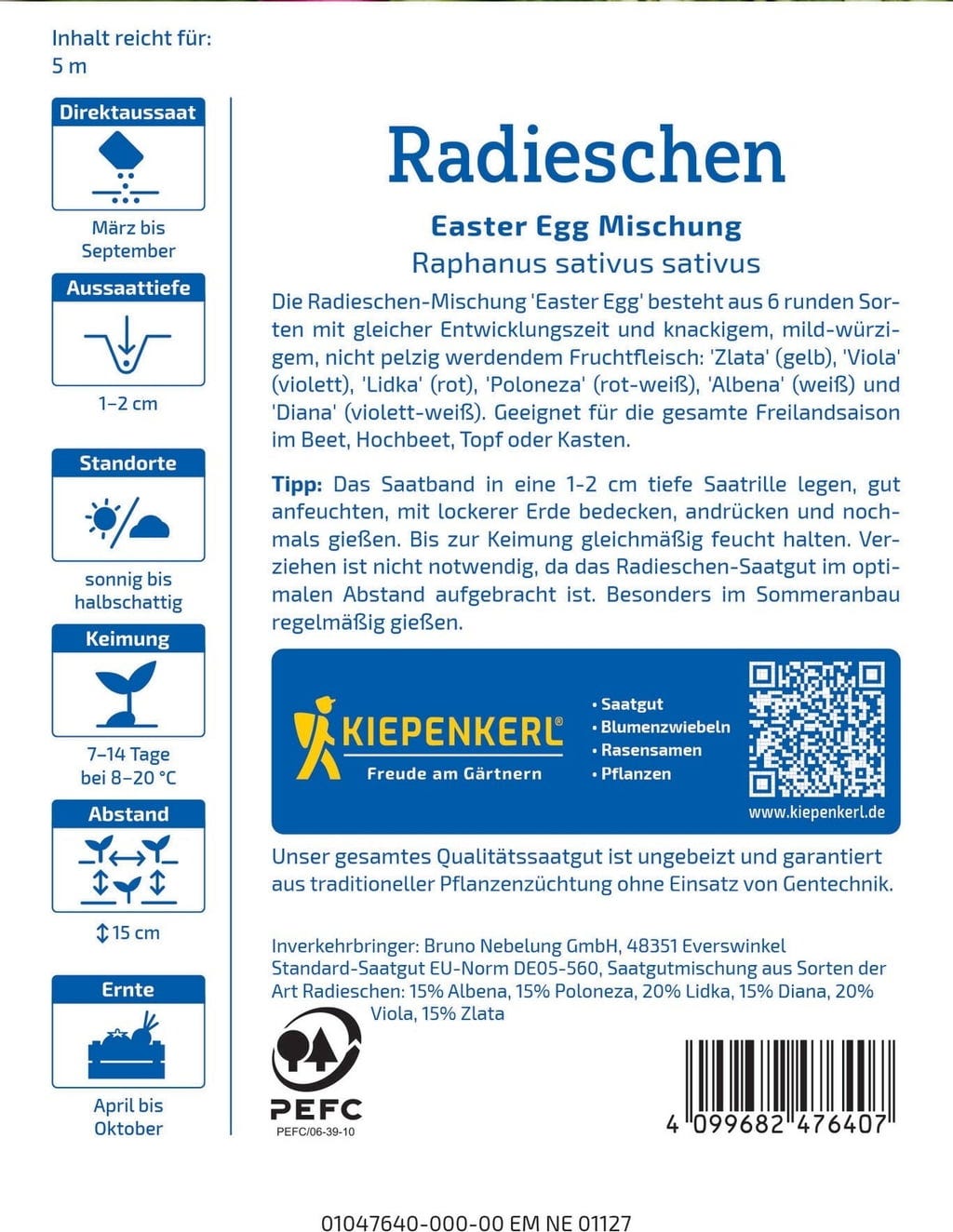 Kiepenkerl Mistura de Rabanetes Egg, Fita de Sementes