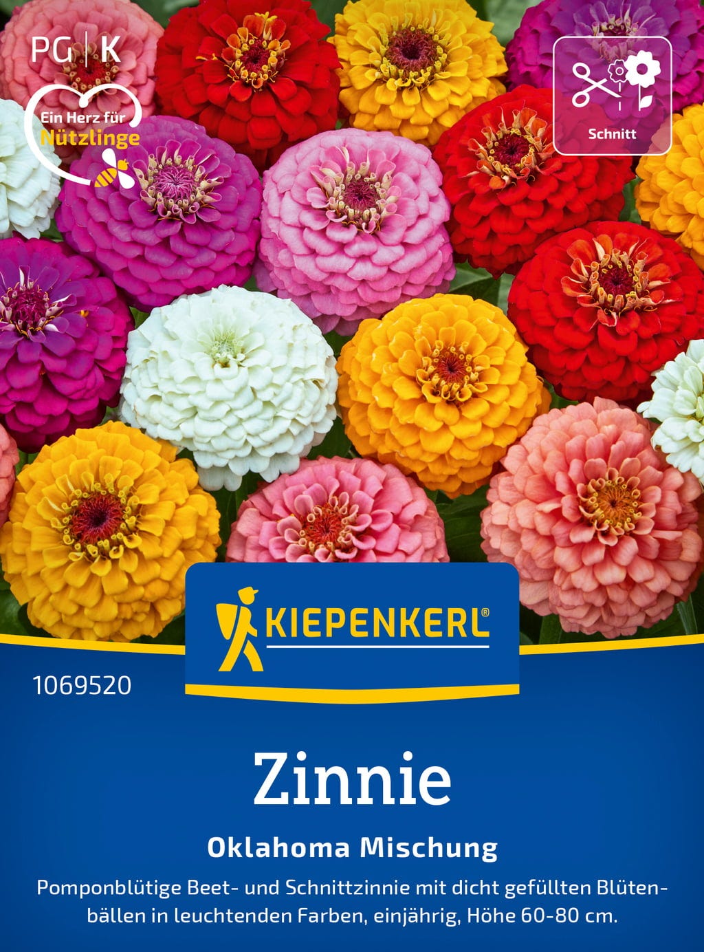 A Mistura de Zínias Oklahoma impressiona com uma variedade de flores pompom brilhantes que proporcionam acentos coloridos até ao outono. Estas flores robustas e de fácil manutenção são ideais para canteiros e bordaduras e, graças à sua durabilidade excecional, são também frequentemente utilizadas como flores de corte.