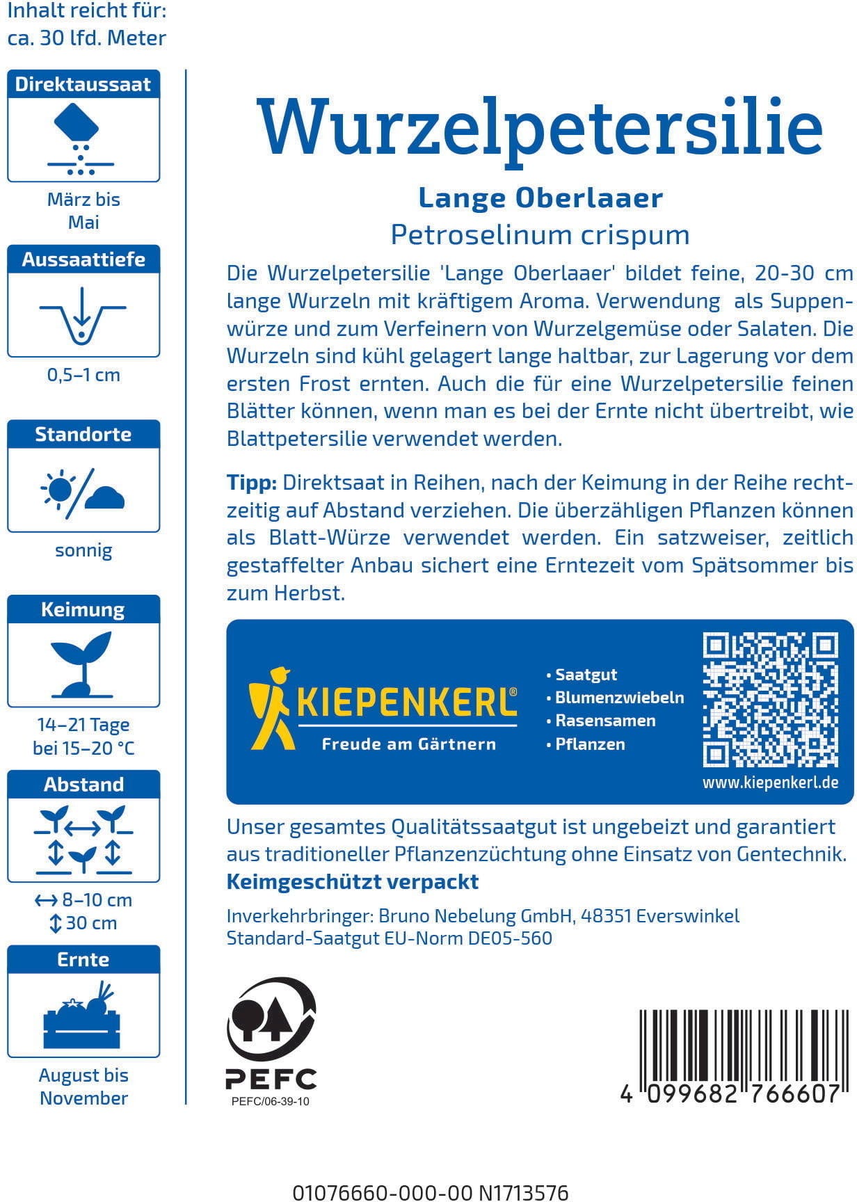 A salsa de raiz „Lange Oberlaaer“ é um verdadeiro clássico para o jardim doméstico. As suas raízes longas e aromáticas conferem um sabor intenso a sopas, guisados ou pratos de legumes – e as folhas tenras podem até ser utilizadas como a salsa comum. Graças à sua boa capacidade de conservação, terá estas raízes aromáticas sempre à mão durante muito tempo.