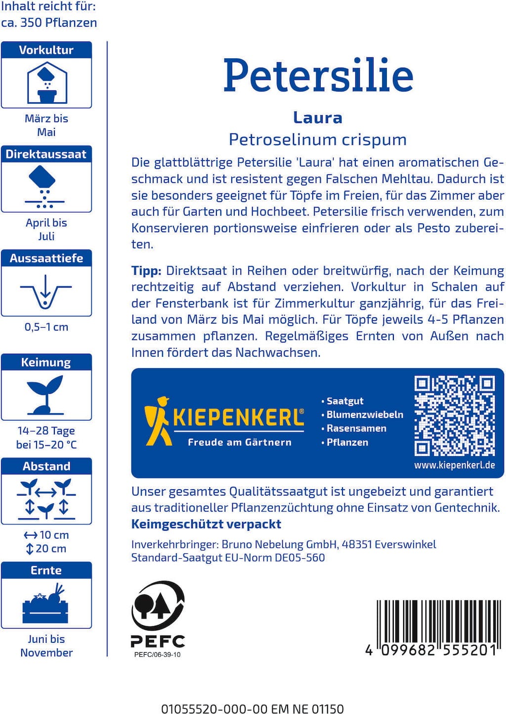 A salsa é uma erva aromática indispensável na cozinha, que confere um toque especial não só a sopas, mas também a pastas e patês. Esta variedade da gama Profi-Line da Kiepenkerl é adequada para o cultivo tanto no interior como no exterior. Forma numerosas folhas lisas com um sabor intenso.