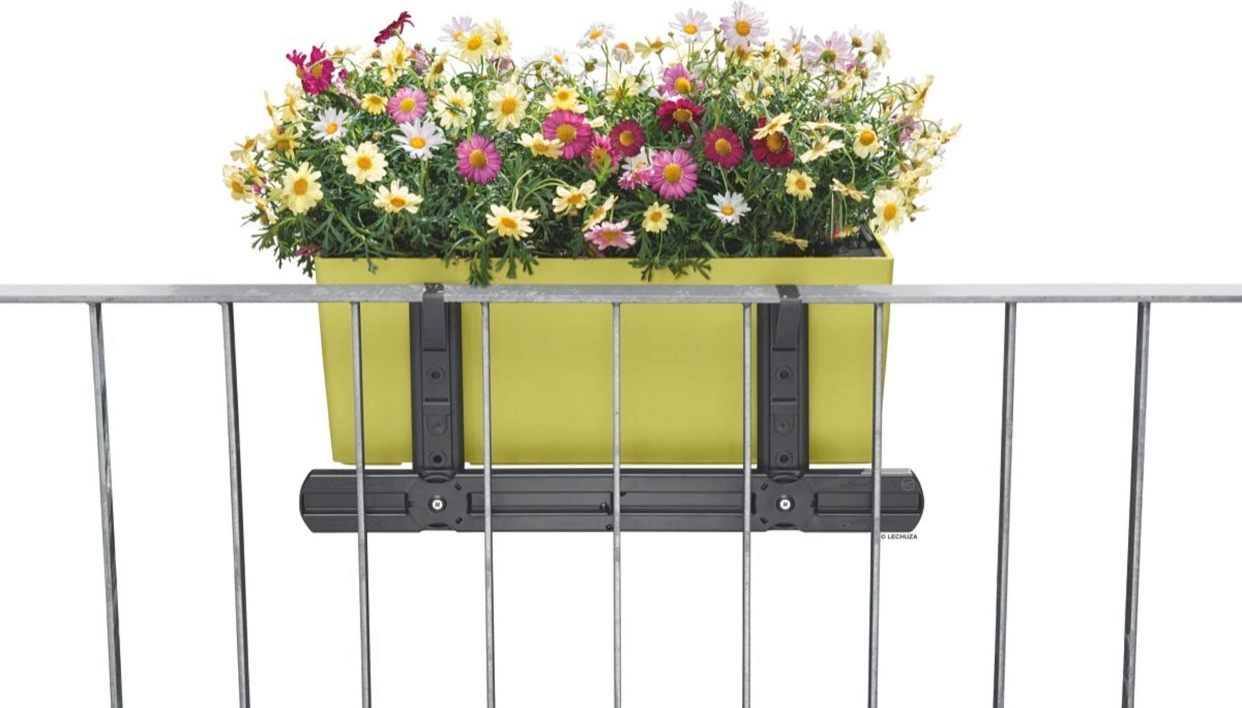 Em combinação com o suporte de floreira de varanda da Lechuza, os vasos "Balconera" nos tamanhos 50 e 80 cm podem agora ser fixados também em grades com grande espaçamento entre as barras.