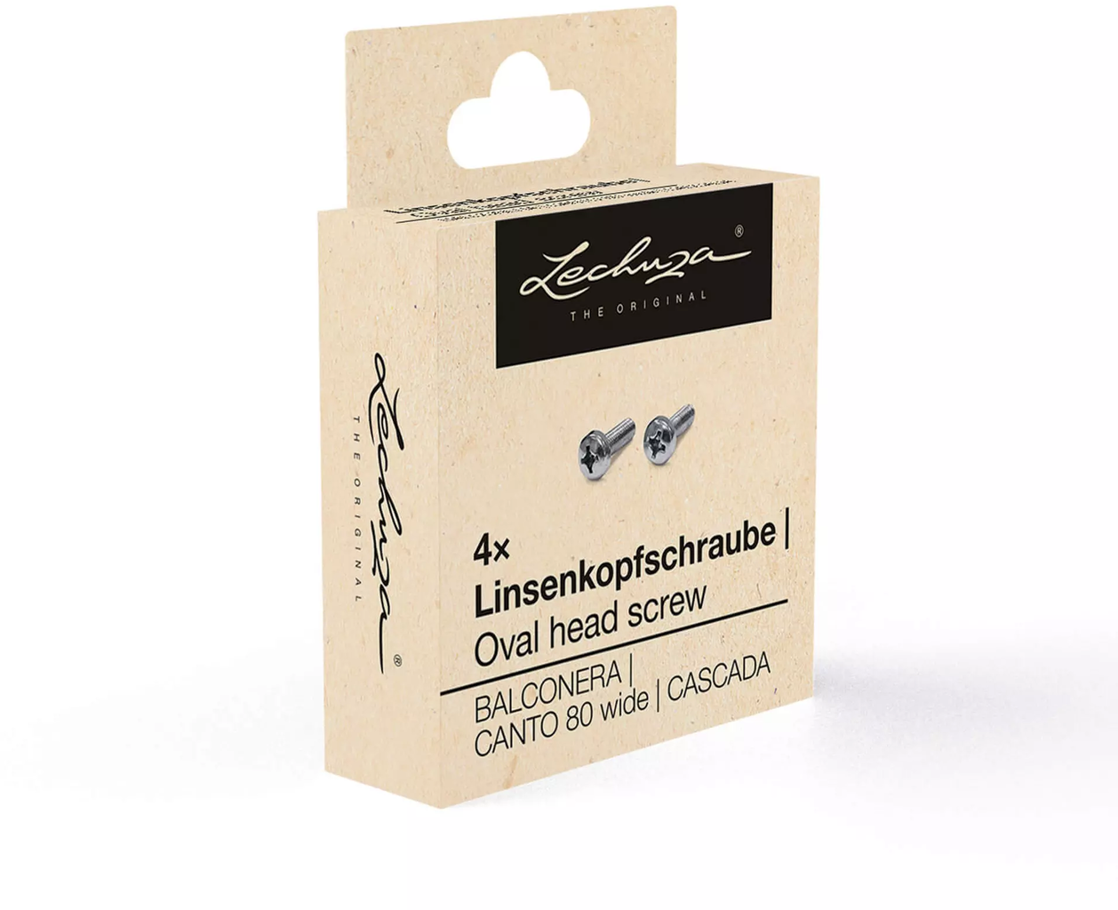 Os parafusos de cabeça lenticular com fenda em cruz são versáteis e utilizados em diversos vasos e acessórios LECHUZA. Graças à superfície galvanizada, os parafusos são ideais para utilização no exterior. Dependendo da finalidade, siga as respetivas instruções de montagem.