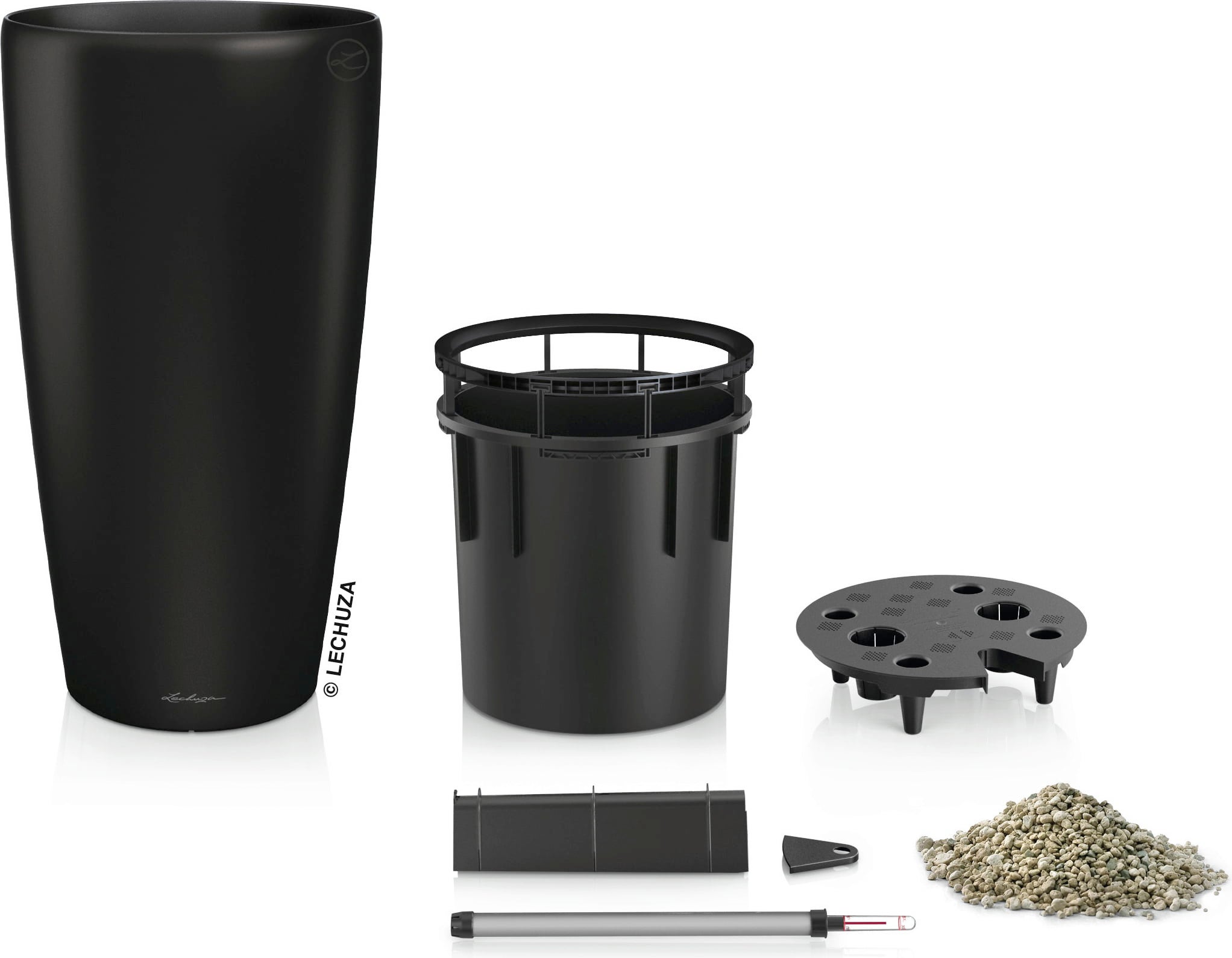 Im Set enthalten sind das Pflanzgefäß, ein Pflanzeinsatz und ein Bewässerungsset.