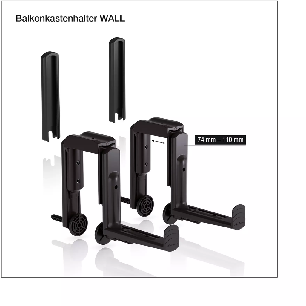 O suporte para floreira de varanda WALL é montado num instante, adapta-se de forma flexível a muros com uma largura de 73,6 mm a 110 mm e garante uma fixação segura para as suas floreiras. Com os parafusos de ajuste, consegue-se um alinhamento preciso, para que as suas plantas fiquem sempre na melhor posição.