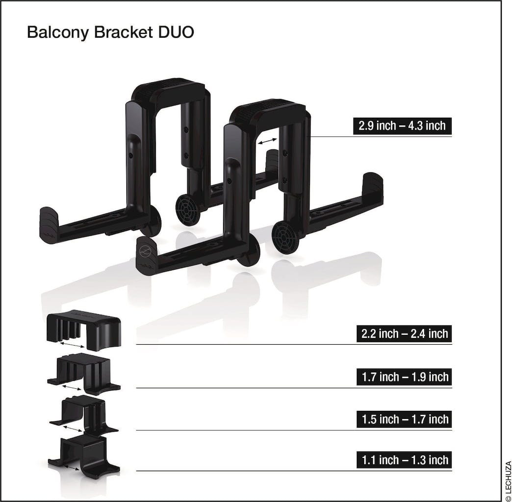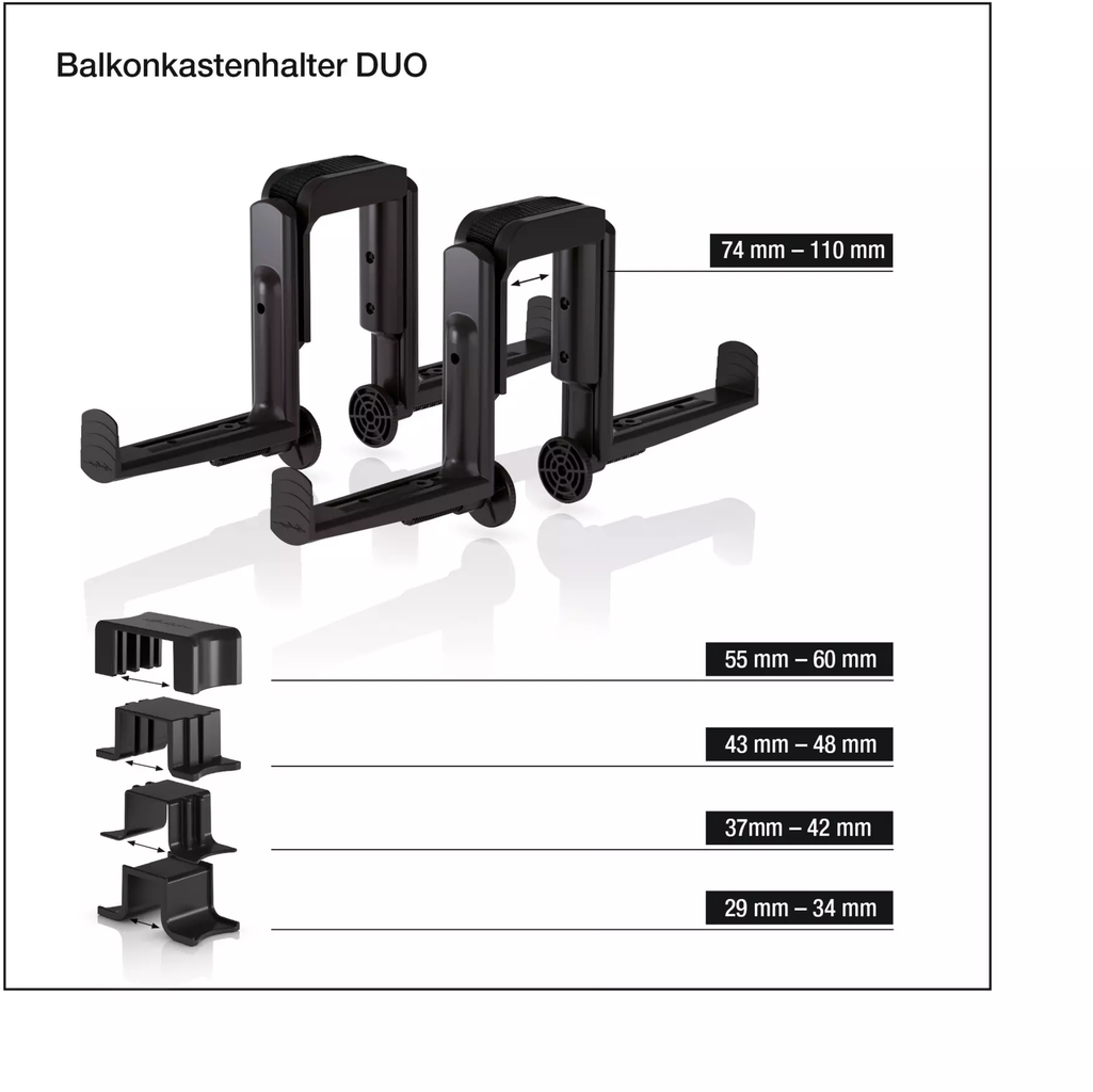 Conteúdo da embalagem: 2 suportes para floreiras de varanda DUO (1 par) com conjunto de adaptadores (4 peças)