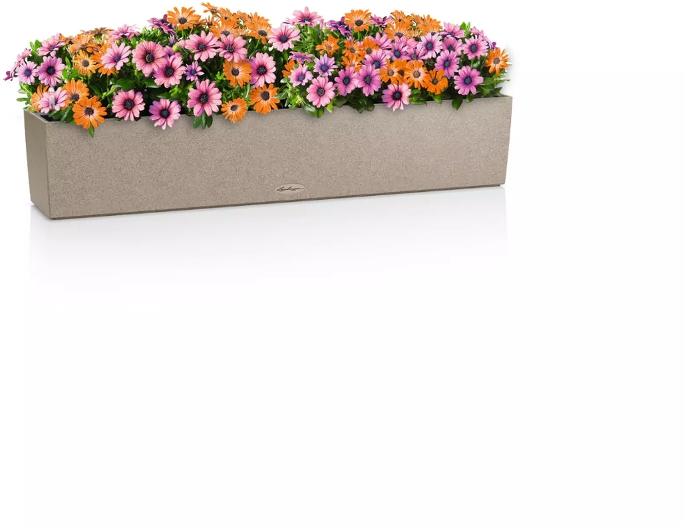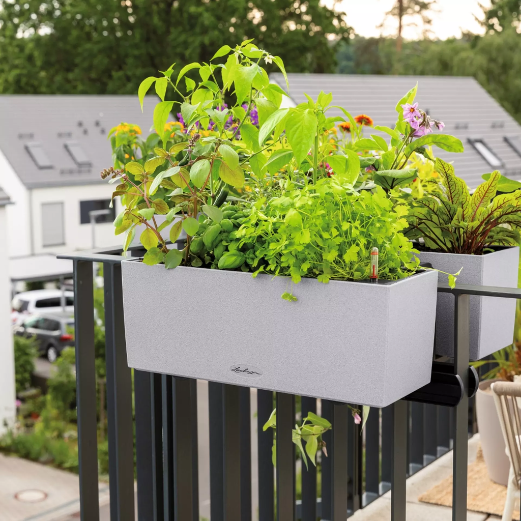 O vaso purista "Balconera Stone" da Lechuza destaca habilmente as suas flores com a sua atraente estrutura de superfície. Além disso, impressiona sobretudo pelas suas propriedades práticas, que farão bater mais forte o coração de qualquer jardineiro. Quer seja colocado de forma independente ou fixado ao corrimão da varanda com o suporte disponível separadamente - esta floreira fabricada em polipropileno resistente aos raios UV é sempre um elemento de destaque elegante.