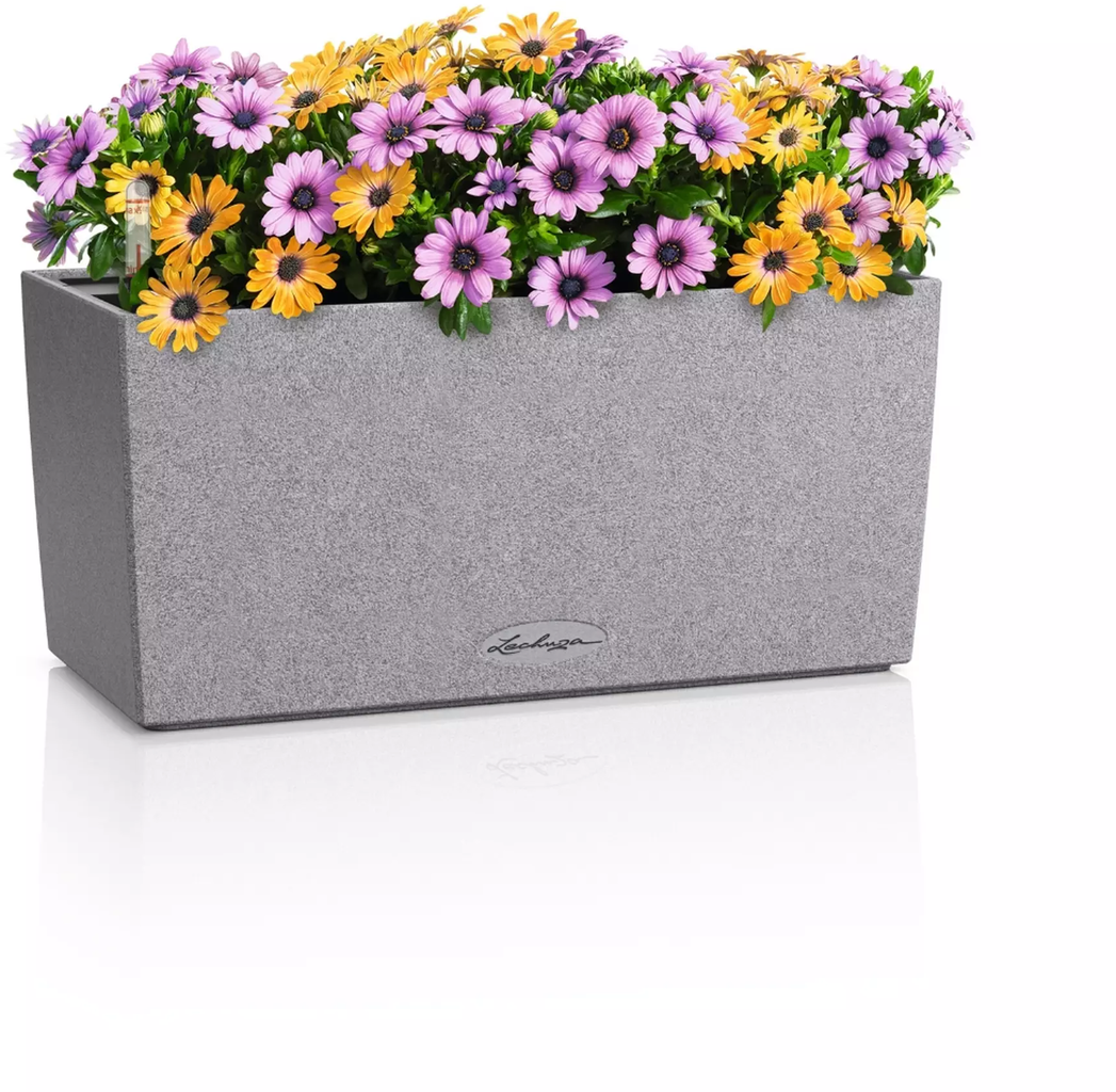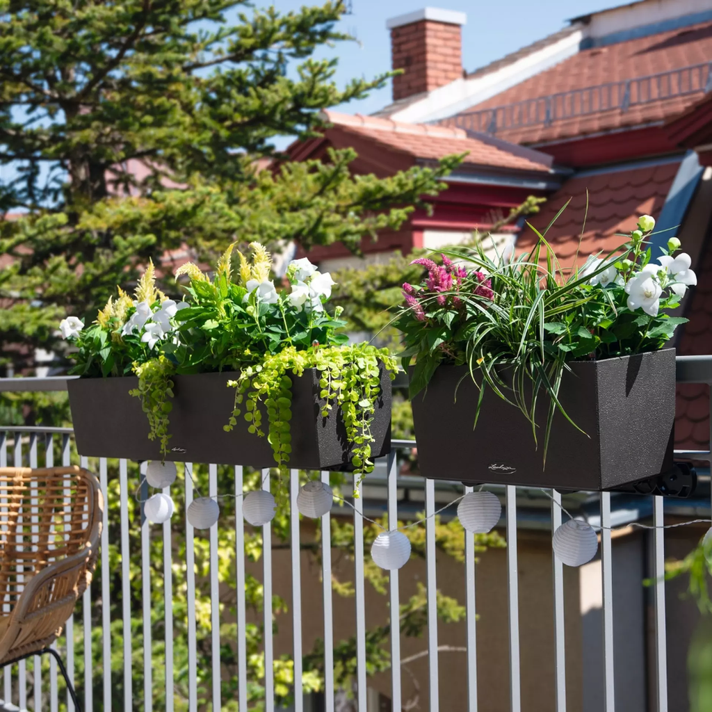 O vaso purista "Balconera Stone" da Lechuza destaca habilmente as flores com a sua atraente estrutura de superfície. Além disso, impressiona sobretudo pelas suas propriedades práticas que fazem bater mais forte o coração de qualquer jardineiro. Quer seja colocado de forma independente ou fixado ao corrimão da varanda com o suporte disponível separadamente - o vaso fabricado em polipropileno resistente aos raios UV é sempre um elemento de destaque elegante.