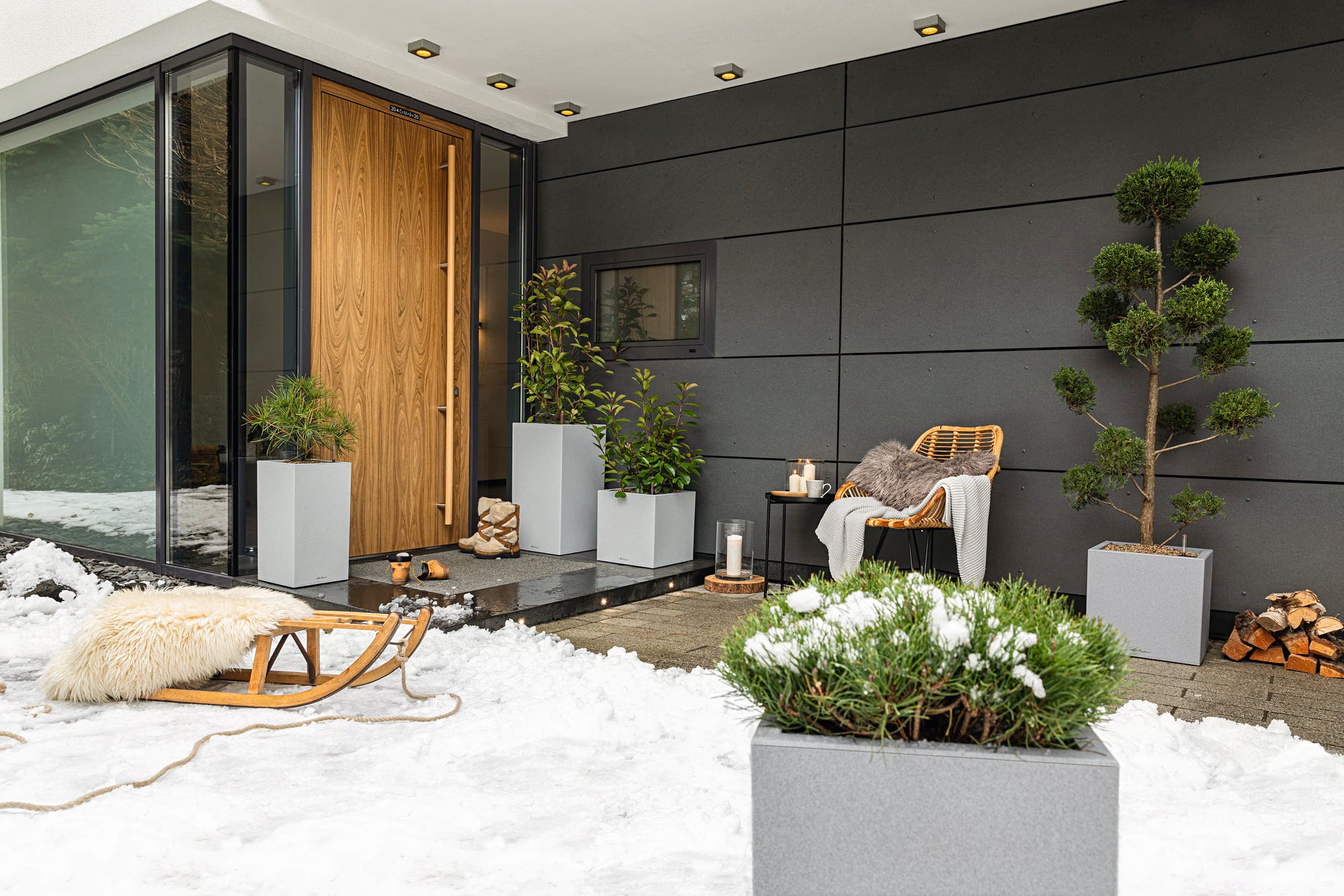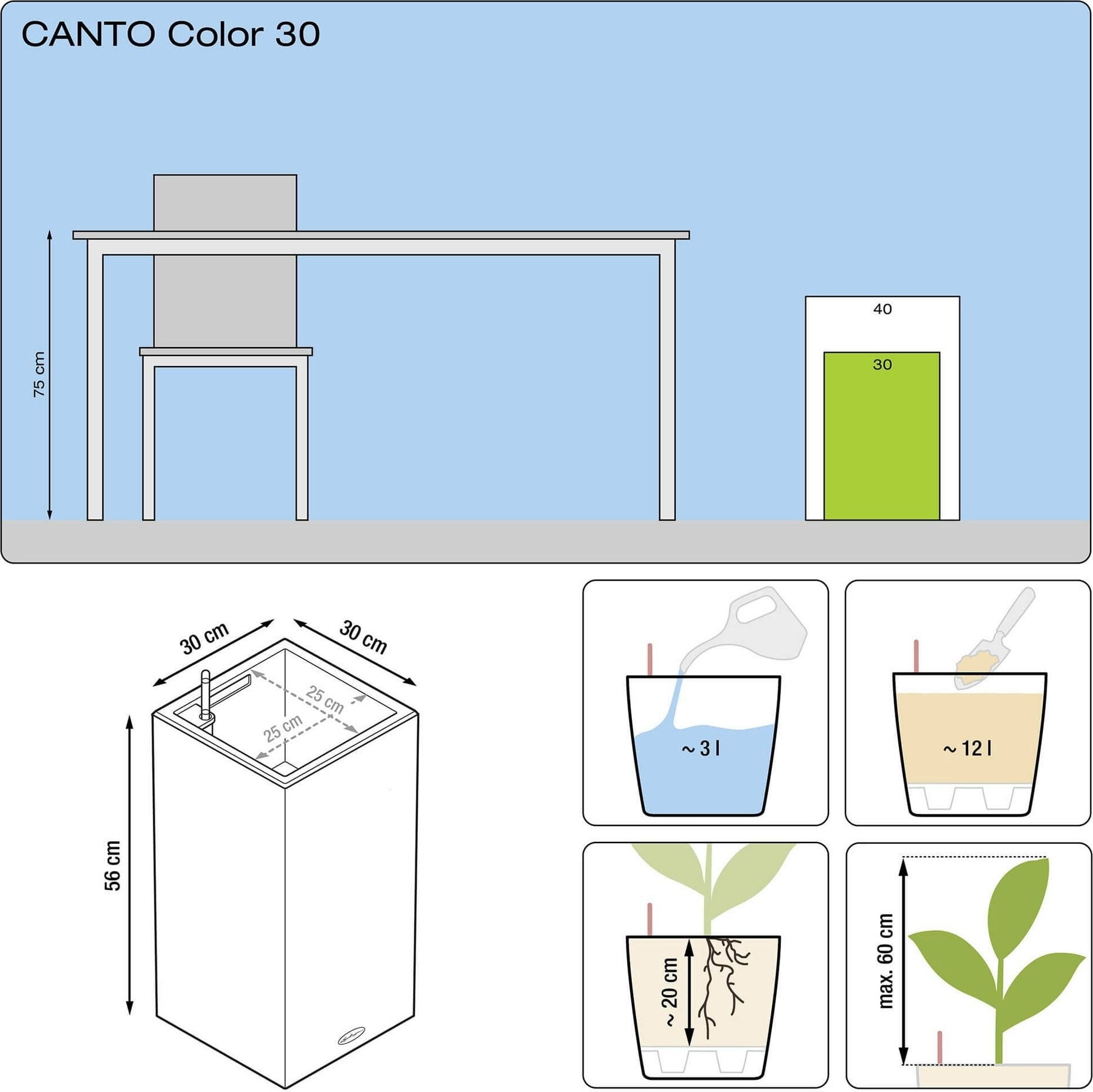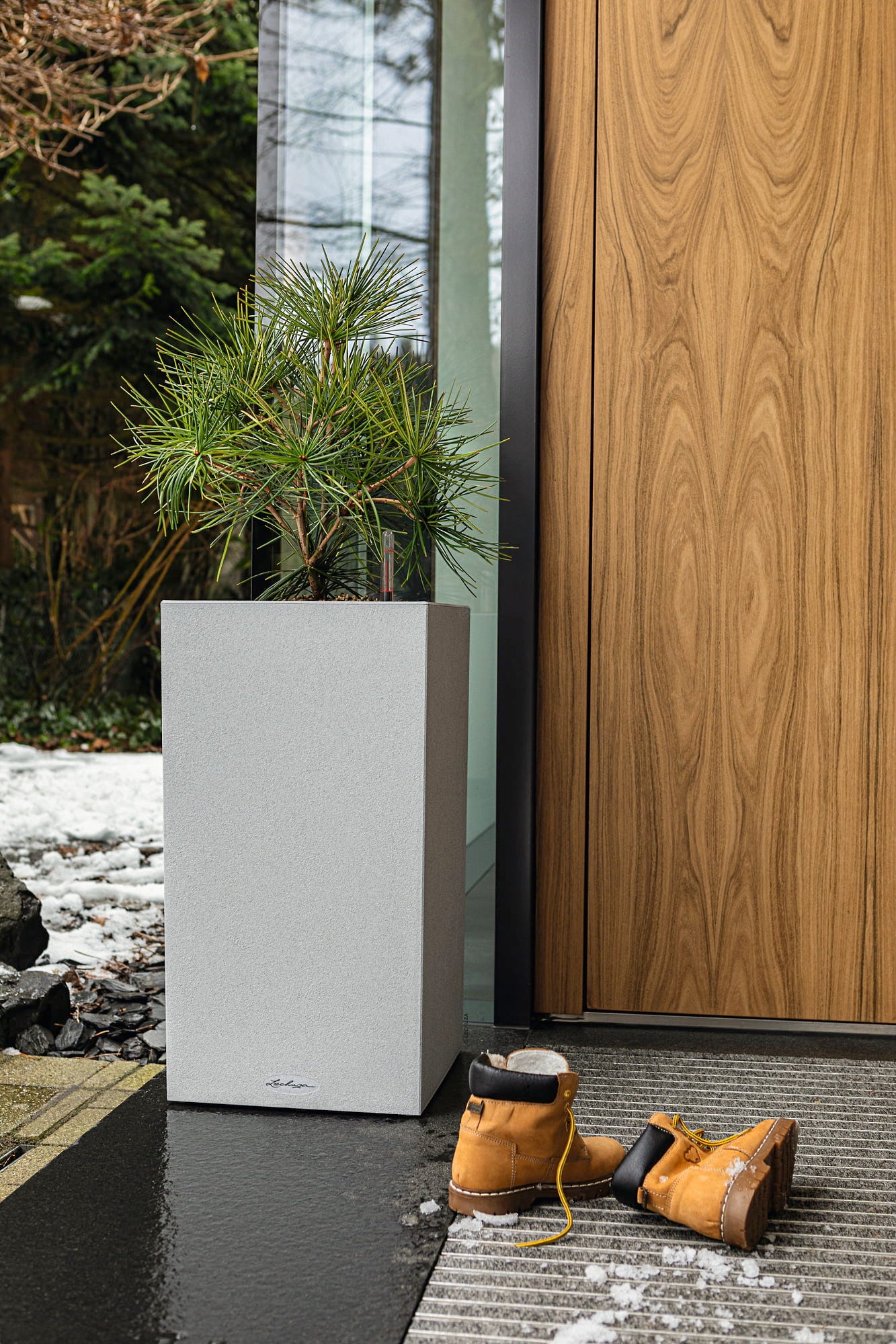 O conjunto inclui o vaso, um suporte para plantas e um kit de irrigação. Graças às mesmas dimensões, o suporte para plantas CANTO Stone pode ser facilmente trocado entre os dois modelos, cubo e coluna.