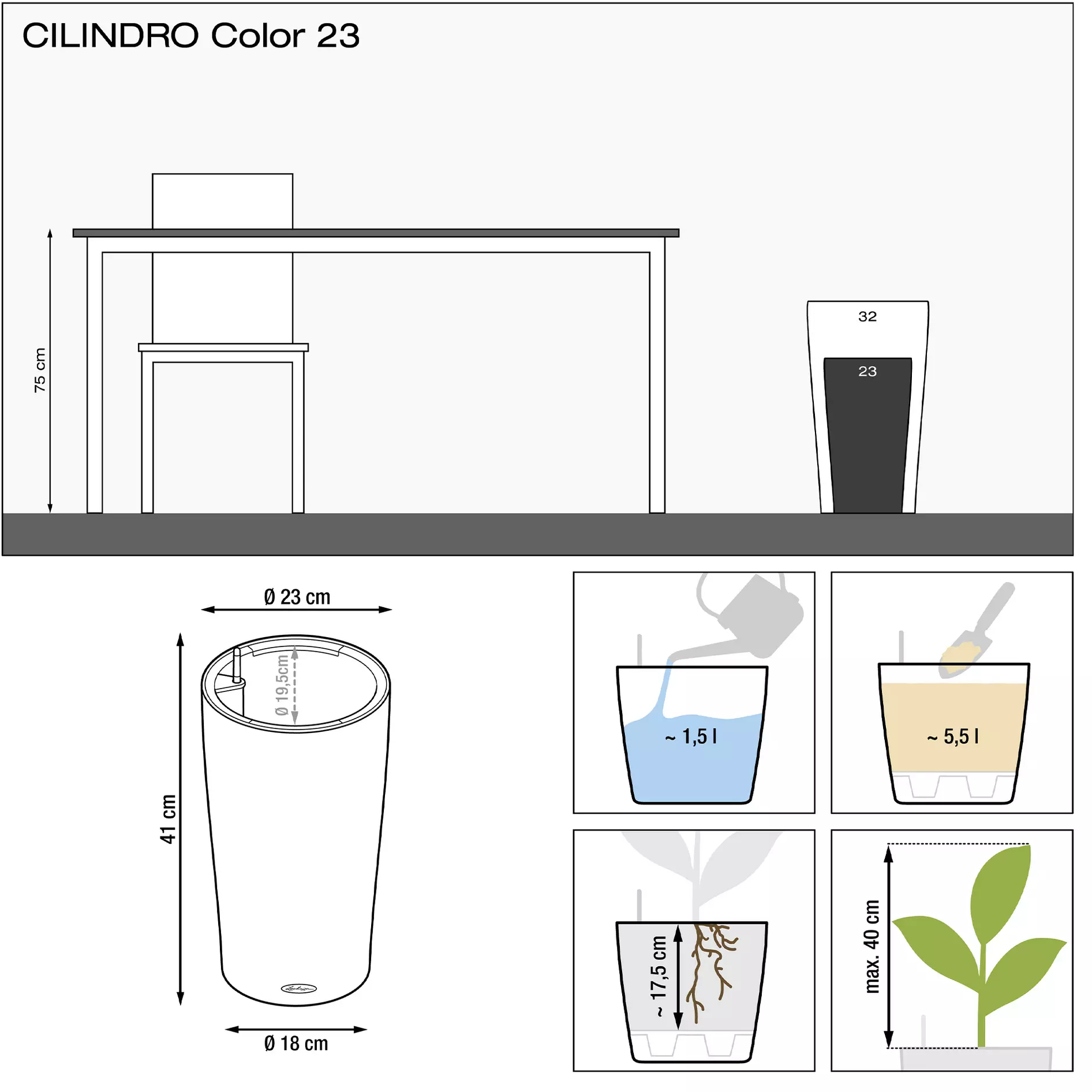 Cilindro é ideal para a criação de conceitos de design de interiores individuais. A elegância simples, a estrutura de linhas discretas, a forma e as cores realçam as suas plantas de forma eficaz. Mas o vaso não convence apenas visualmente: com o comprovado sistema de irrigação de solo, o Cilindro garante um crescimento ideal das plantas. Através do reservatório de água, as plantas cuidam de si mesmas. Graças à prática função de transbordamento, não ocorre acumulação de água no vaso, mesmo quando utilizado no exterior.