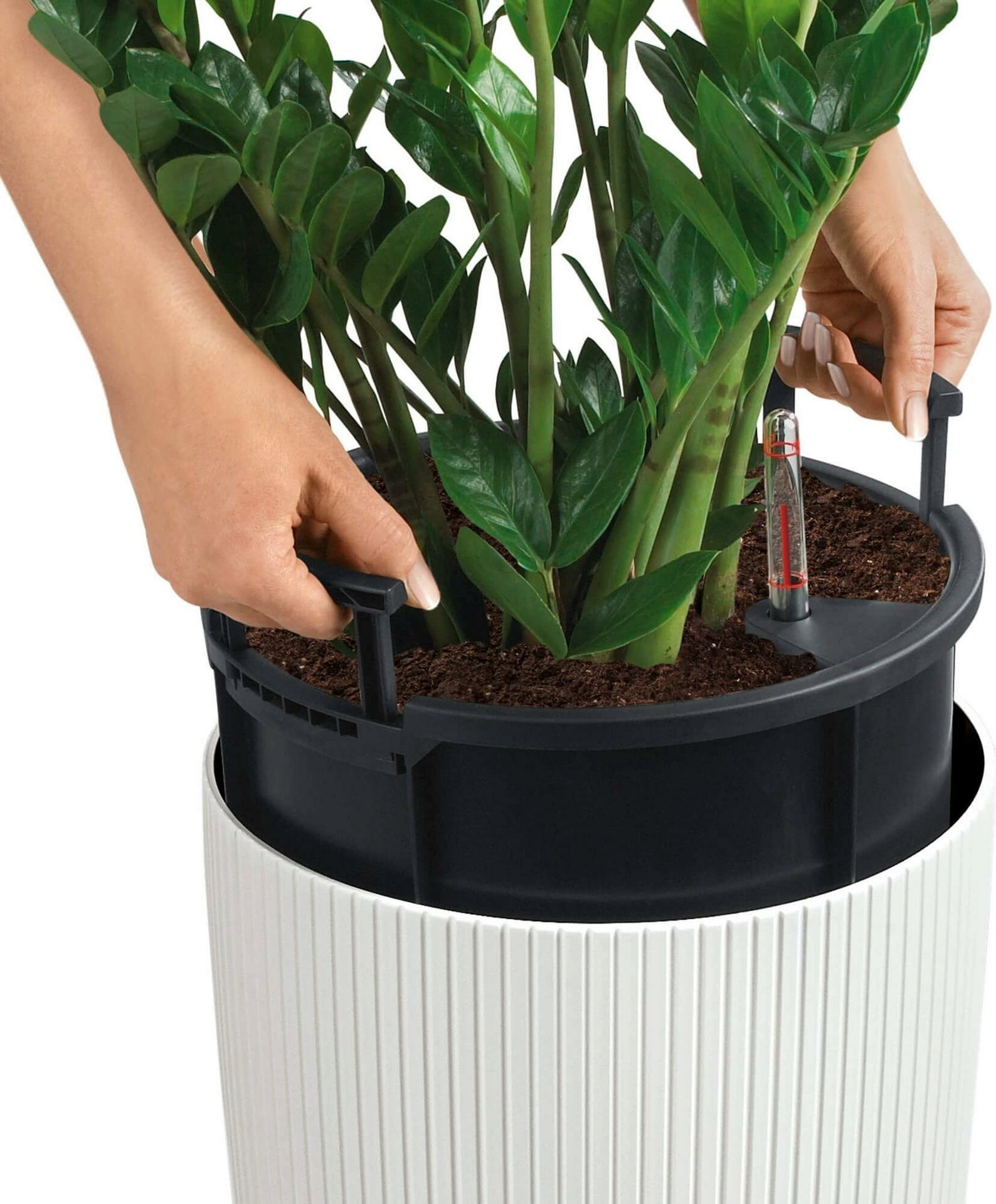O Cilindro está equipado como um conjunto All-in-One com vaso, suporte de plantio, indicador de nível de água e substrato de plantio.