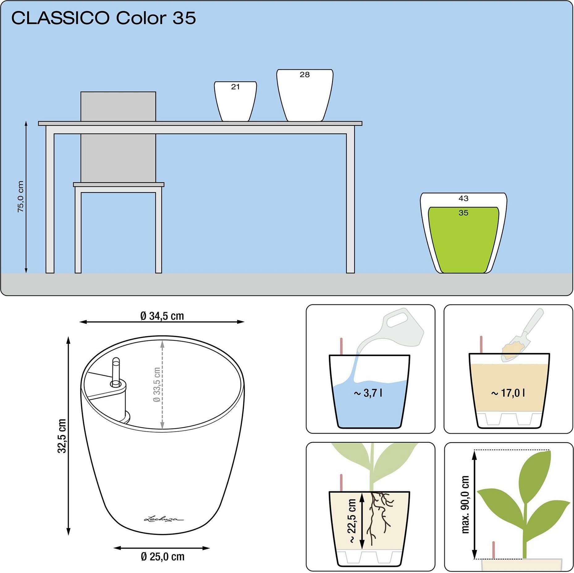 O vaso Classico Color 35 da Lechuza destaca as suas plantas de forma particularmente bela, tanto no interior como no exterior. O design intemporal integra-se maravilhosamente em qualquer ambiente - seja na sala de estar e de jantar ou no terraço e na varanda.