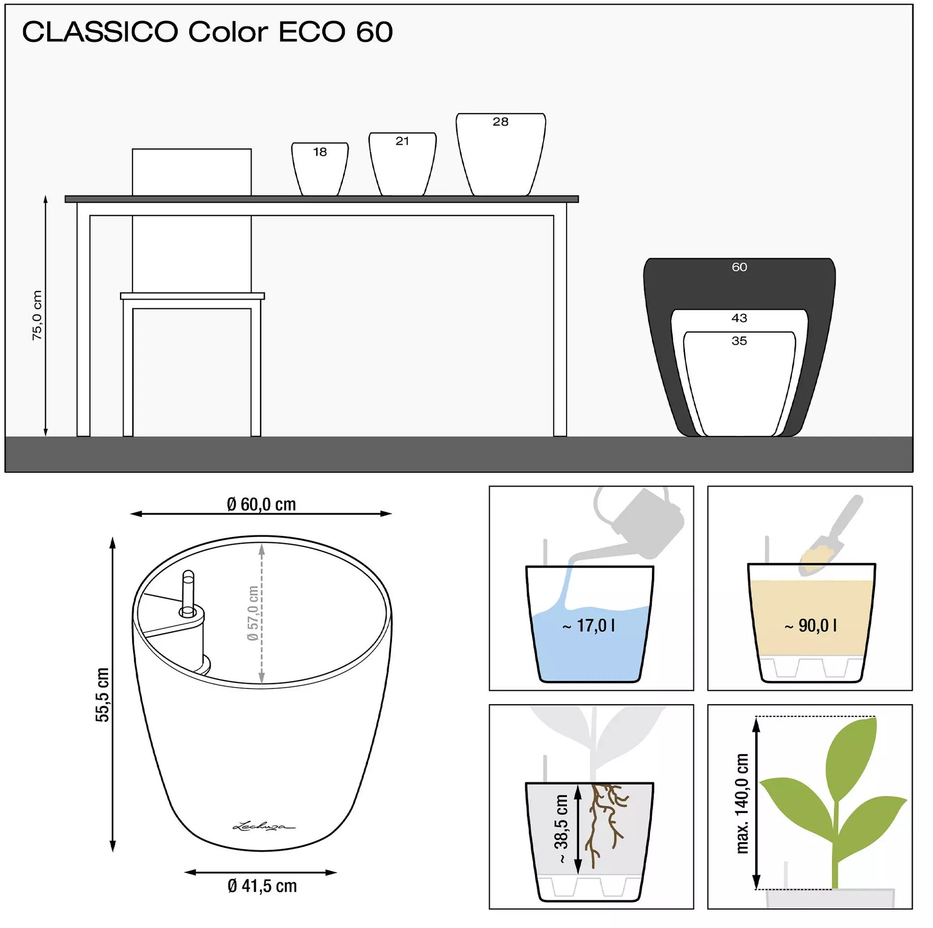 - Sistema de irrigação clássico, incluindo indicador de nível de água e parafuso de drenagem, para que o excesso de água da chuva ou da rega possa escoar