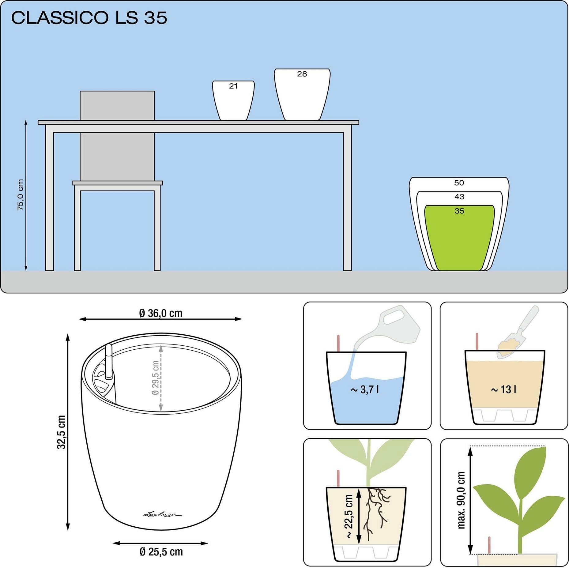 Este vaso de alta qualidade CLASSICO Premium 35 LS da Lechuza é fabricado em polipropileno resistente a quebras e aos raios UV. Graças à sua forma intemporal, o vaso é adequado para qualquer espaço habitacional. Com o sistema de revestimento patenteado, as plantas podem ser trocadas facilmente.