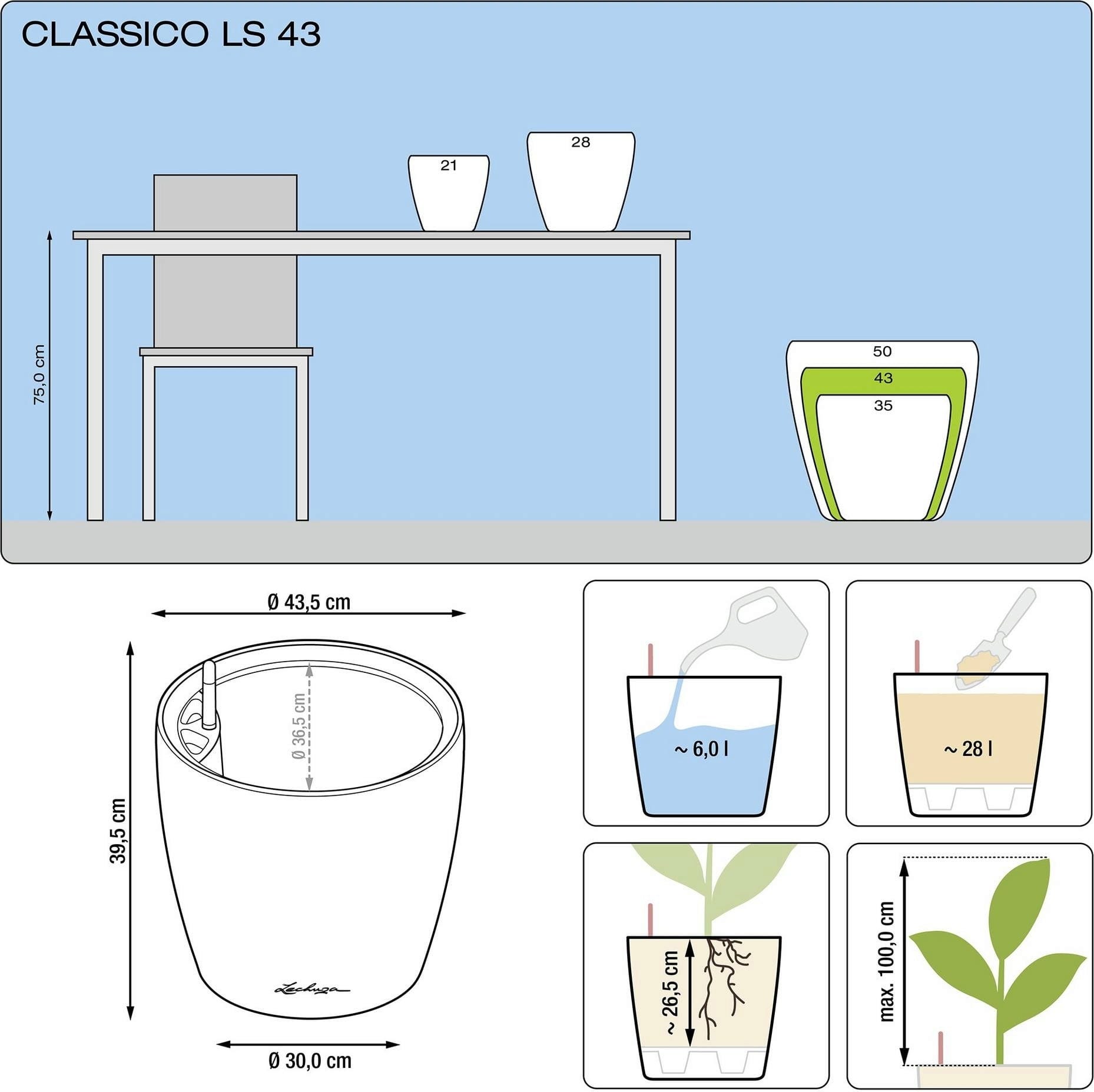 Este vaso de alta qualidade CLASSICO Premium 43 LS da Lechuza é fabricado em polipropileno resistente a quebras e aos raios UV. Graças à sua forma clássica, o vaso é adequado para qualquer espaço habitacional. Com o sistema de revestimento patenteado, a plantação pode ser facilmente trocada.