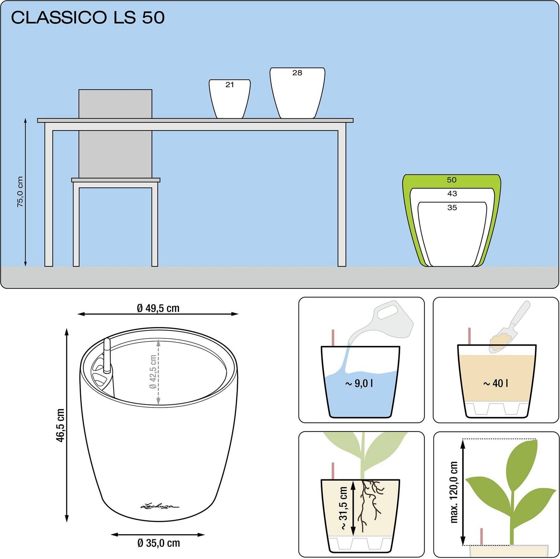 Este vaso de alta qualidade CLASSICO Premium 50 LS da Lechuza é fabricado em polipropileno resistente a quebras e aos raios UV. Graças à sua forma clássica, o vaso é adequado para qualquer espaço habitacional. Com o sistema de revestimento patenteado, a plantação pode ser facilmente trocada.