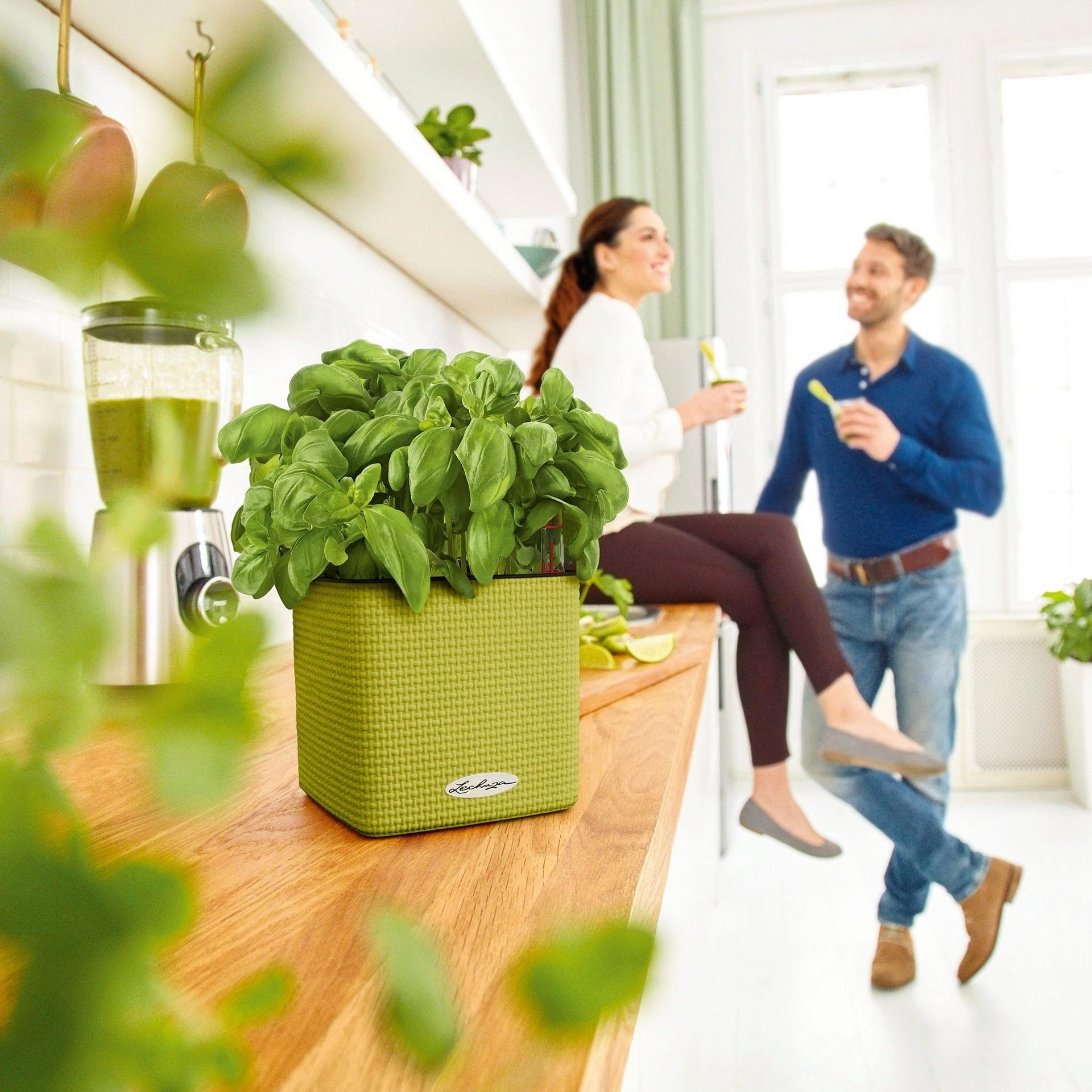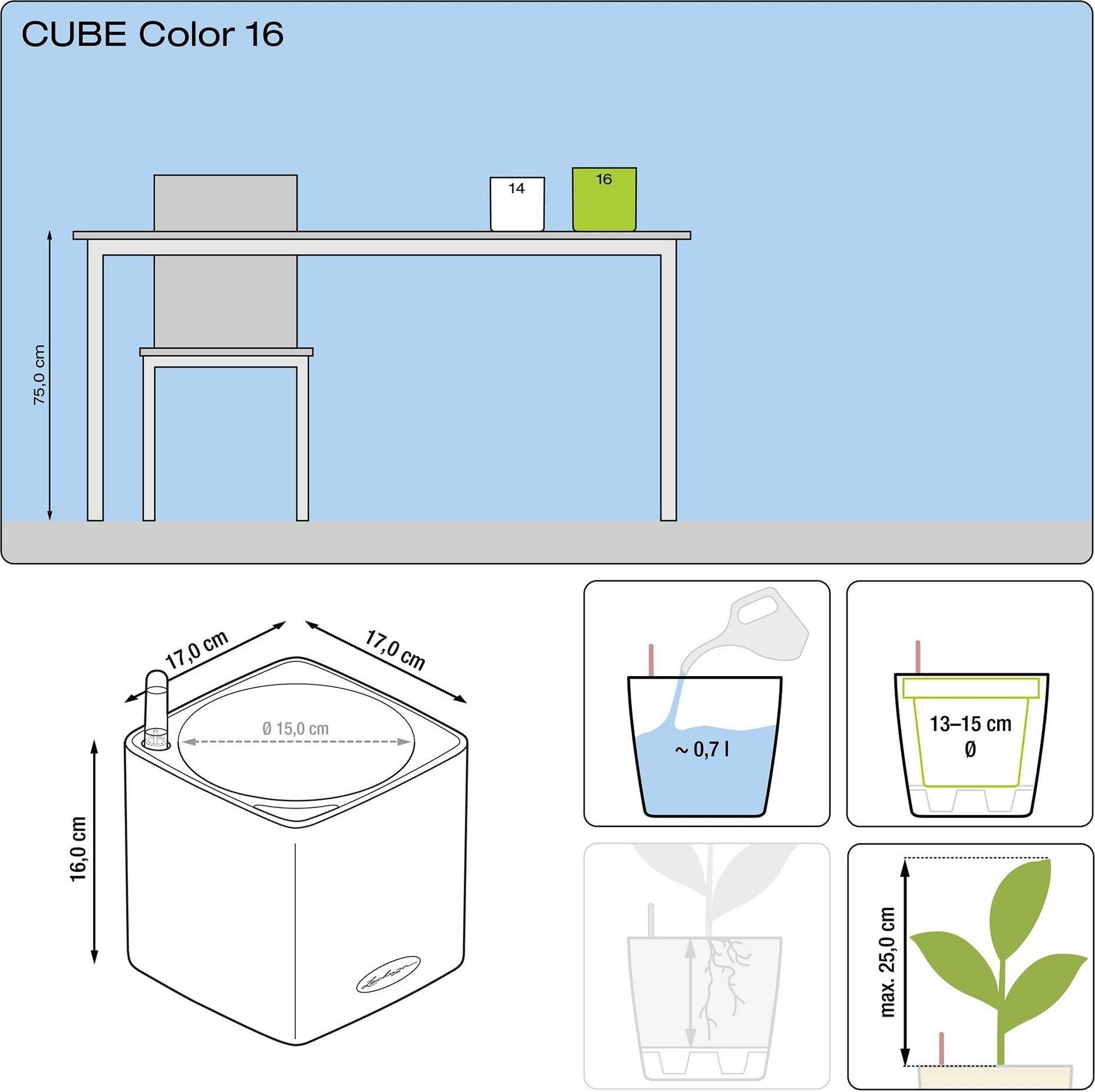 Este belo vaso para ervas Cube Color 16 da Lechuza possui um sistema de irrigação por pavio. Manjericão, cebolinho, alecrim ou plantas ornamentais anuais são inseridos juntamente com o vaso de cultivo, não sendo mais necessário o transplante. Basta inserir o pavio fornecido na parte inferior do vaso e regar como de costume. A planta absorve a quantidade necessária de água.