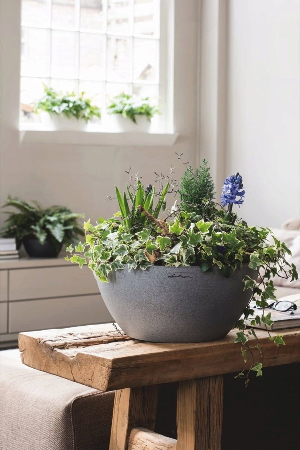 A forma plana da taça redonda CUBETO 40 da Lechuza oferece espaço para arranjos de plantas criativos. Graças ao seu contorno clássico e ao aspeto de pedra natural, esta taça é versátil – seja como objeto decorativo em casa, na entrada ou no terraço, com este vaso as suas plantas tornar-se-ão um verdadeiro destaque. Também pode ser utilizado como uma elegante decoração para campas.