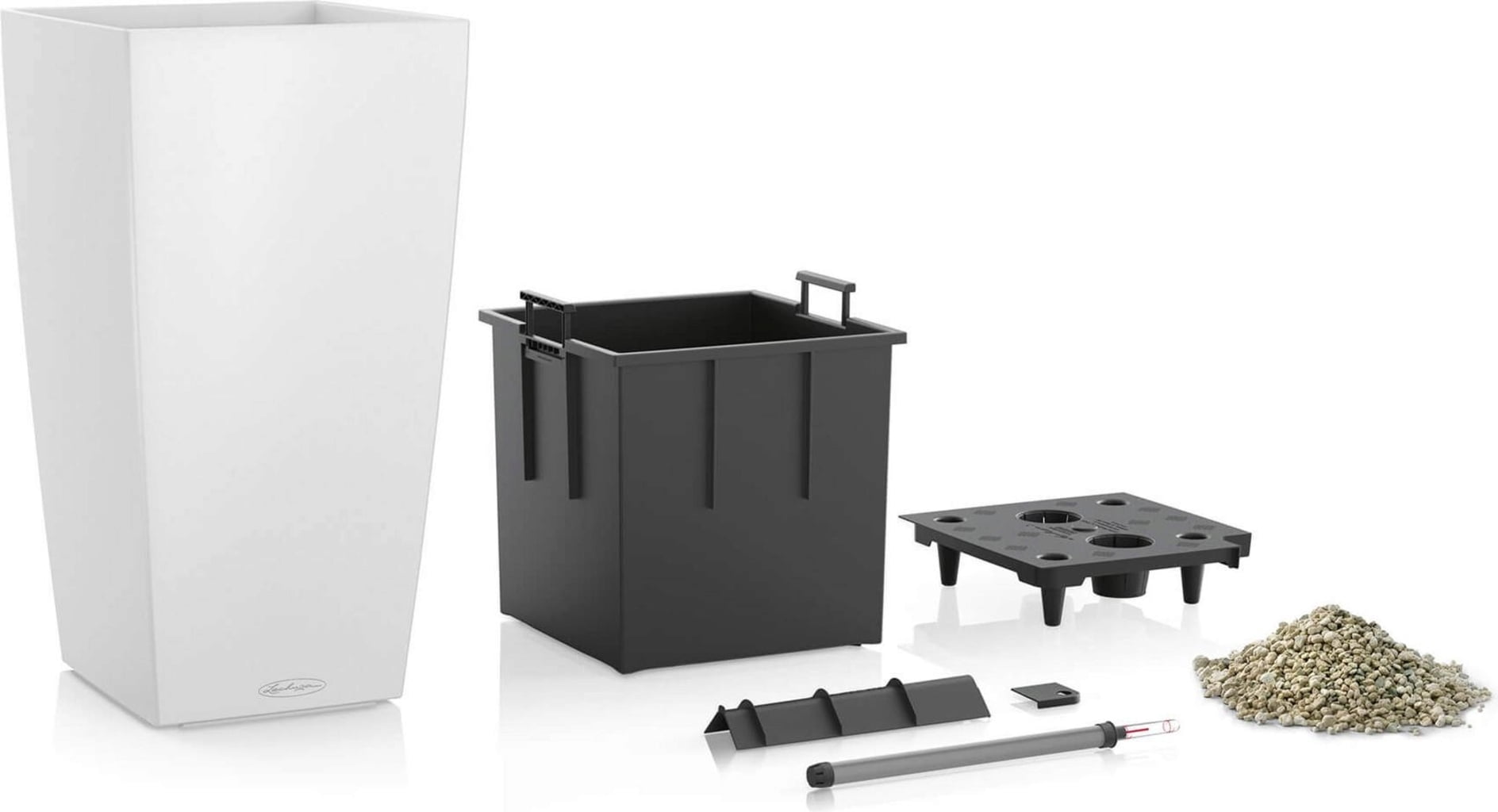 Interior inteligente: O suporte de plantio amovível com pegas retráteis e o sistema de irrigação patenteado da Lechuza não só garantem uma troca confortável das plantas, mas também plantas magníficas e vitais.