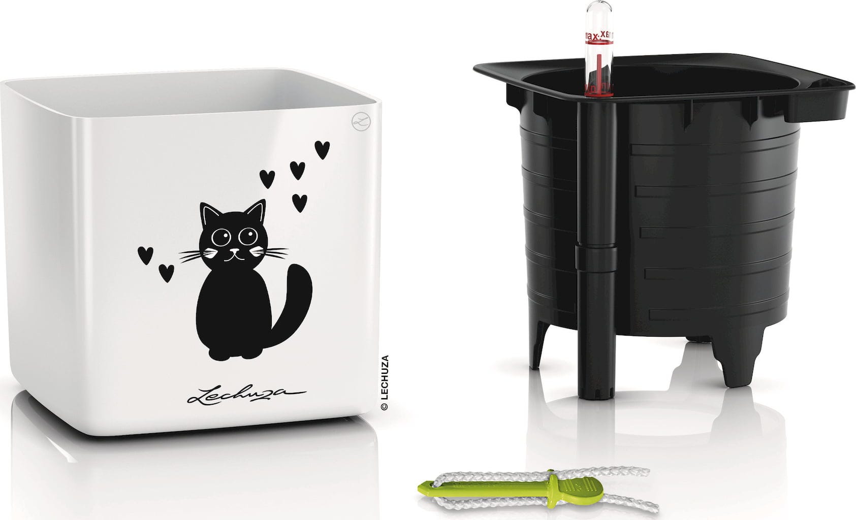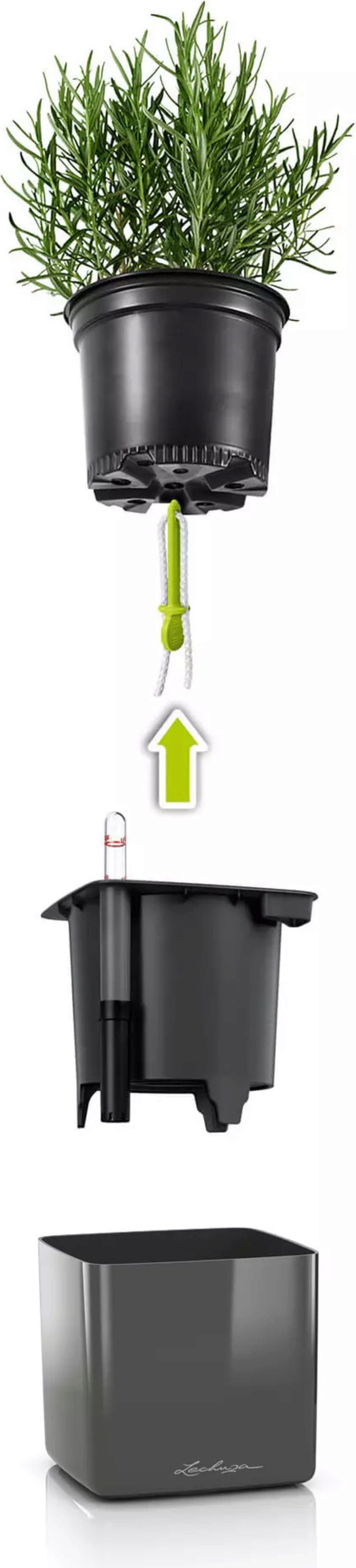 Para que o cuidado das plantas não consuma demasiado tempo, o sistema de irrigação Lechuza encarrega-se do abastecimento da planta. Nos vasos da coleção Cube Premium, as plantas podem ser colocadas facilmente com o vaso de cultivo original, sem a necessidade de um transplante trabalhoso. Um stick, inserido no vaso de cultivo por baixo, transporta a humidade uniformemente para as raízes. Através do indicador de nível de água, é possível verificar quando é altura de regar novamente.