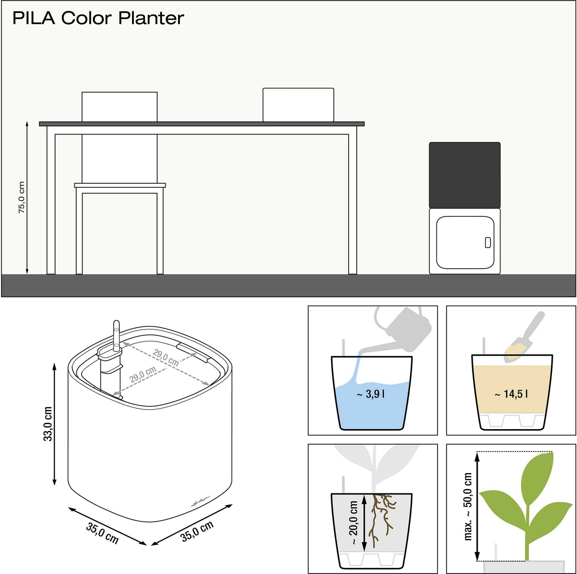 \n\nNota: O volume de fornecimento inclui o vaso, o revestimento de plantio e o sistema de irrigação. Outros elementos da gama PILA, bem como o prático suporte com rodas, estão disponíveis separadamente.