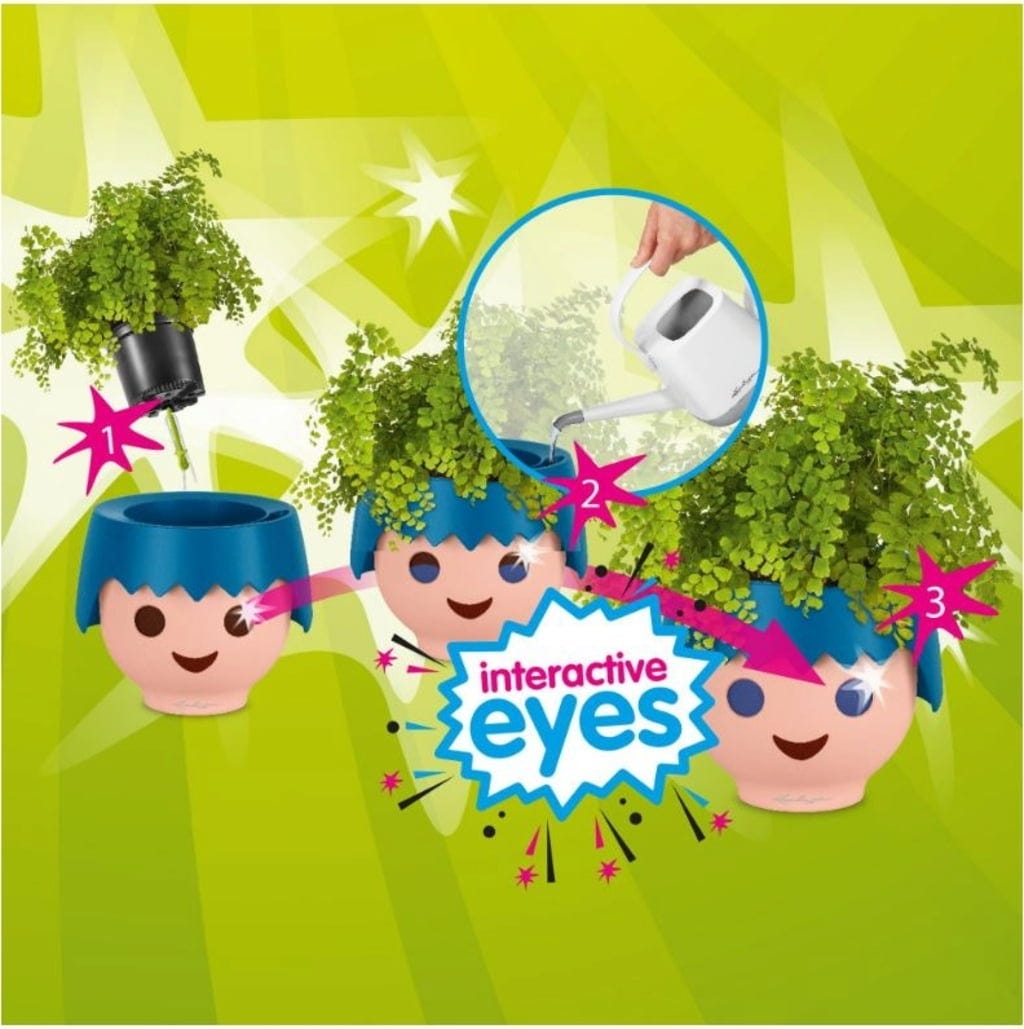 OJO é modelado com base na cabeça de uma figura PLAYMOBIL, que ganha um penteado divertido através das plantas. Os olhos grandes e redondos no típico visual PLAYMOBIL indicam a quantidade de água no reservatório. Se os Interactive Eyes ficarem azuis, o reservatório de água está cheio. Assim, as crianças podem estar sempre atentas ao bem-estar da planta.
