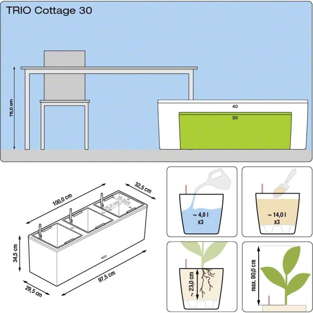 O TRIO Cottage 30 da Lechuza é um biombo e uma horta, tudo em um. Graças aos seus revestimentos de plantas substituíveis, esta floreira versátil é perfeita como divisória de terraço ou proteção visual. Ideal para o cultivo próprio de frutas e legumes, bem como para a plantação de flores ou plantas verdes.