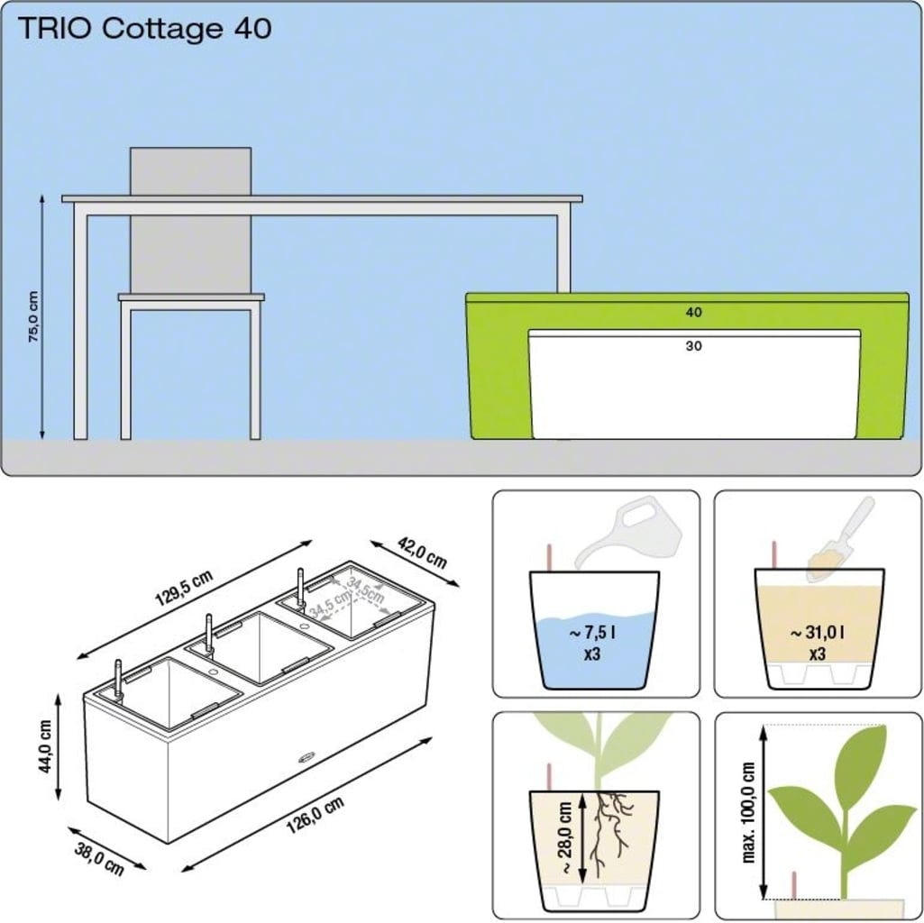 O TRIO Cottage 40 da Lechuza é uma proteção visual e uma horta, tudo em um. Graças aos seus cestos de plantio intercambiáveis, este vaso versátil é perfeito como divisor de terraço ou proteção visual. Perfeito para o cultivo próprio de frutas e legumes, bem como para a plantação de flores ou plantas verdes.