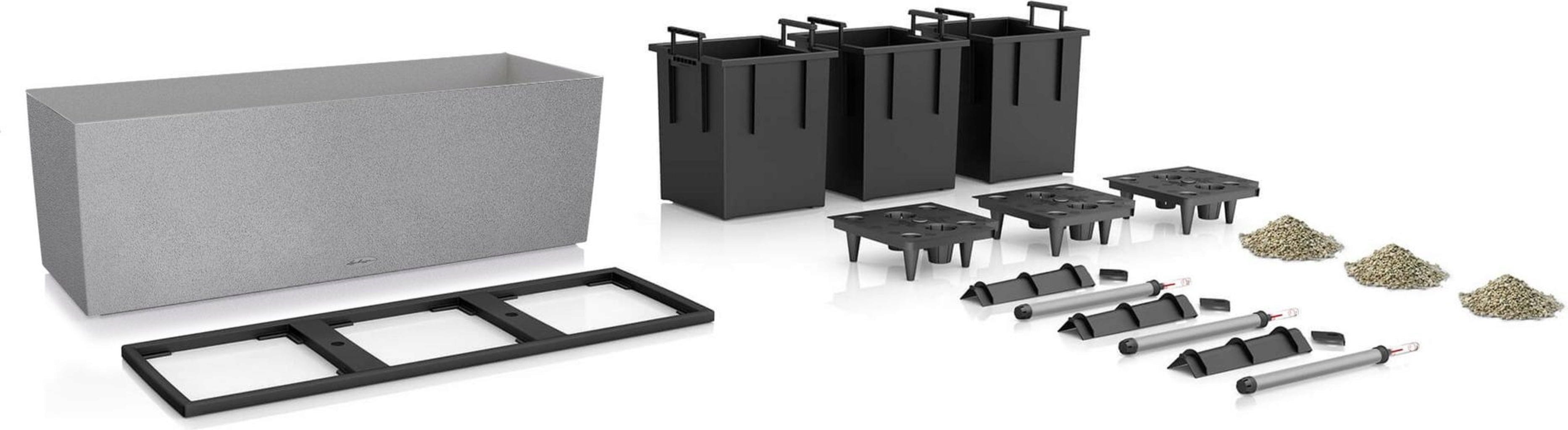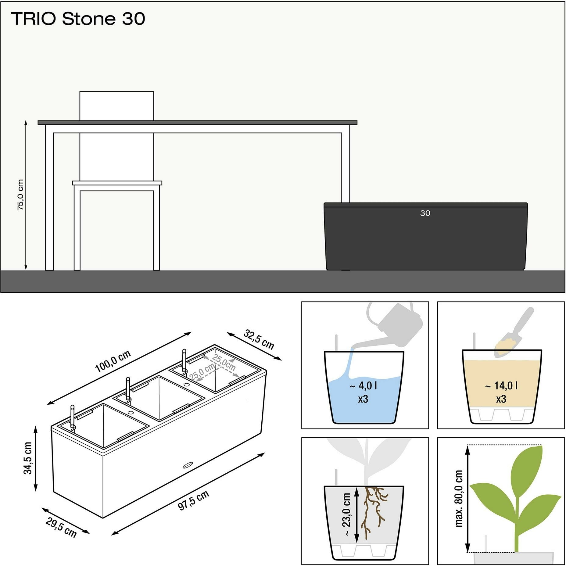 O elegante vaso TRIO Stone 30 impressiona tanto pelo seu design intemporal com um atraente aspeto de pedra, como pelo seu interior inteligente. Três revestimentos para plantas amovíveis, incluindo o sistema de rega patenteado, tornam-no a escolha perfeita para o cultivo de frutas e legumes, bem como de flores decorativas. Ideal para jardins, terraços ou varandas maiores - como divisória de meia altura, mini-canteiro ou floreira.