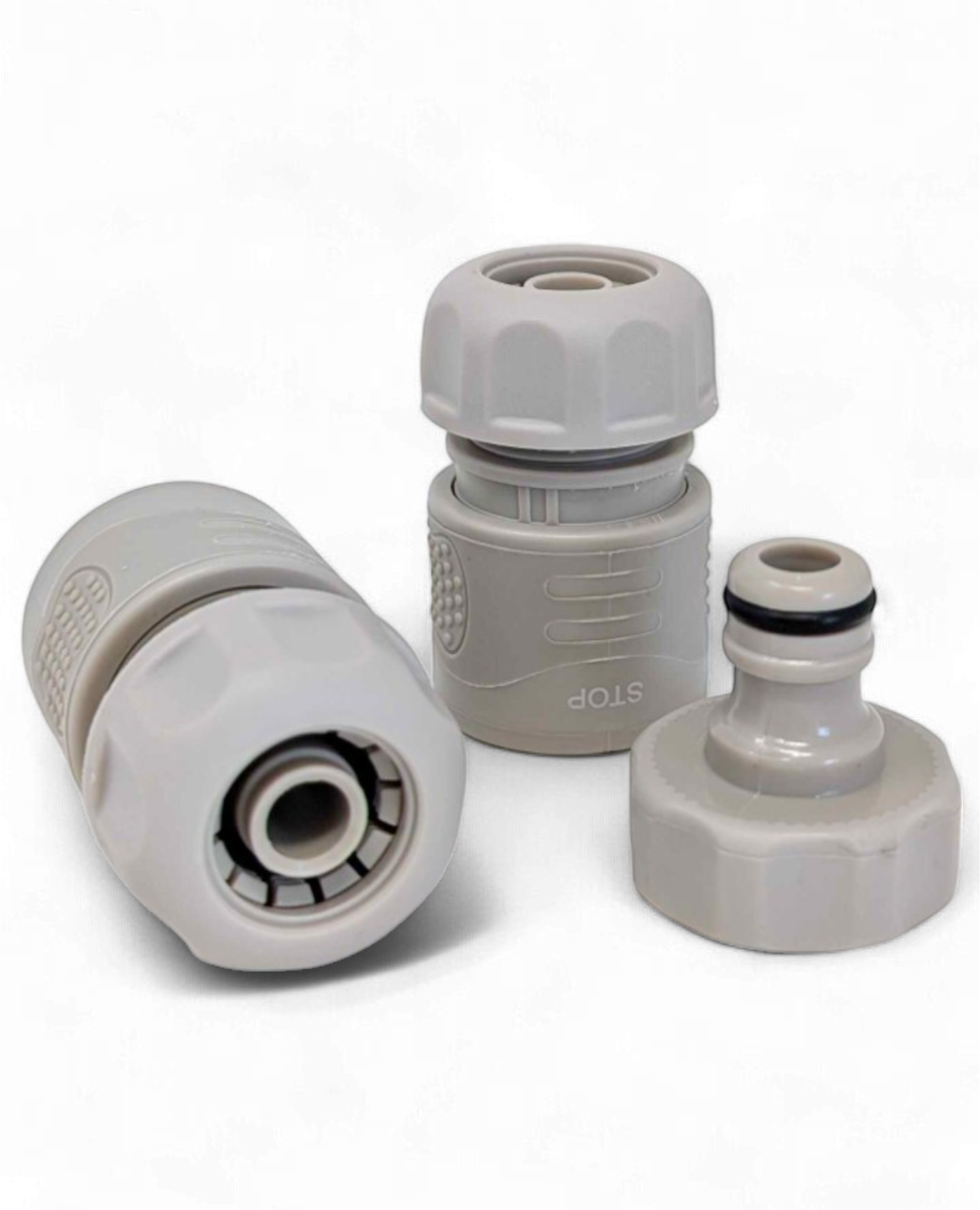 - Conjunto de 3 peças composto por conector de mangueira de 1/2 polegada, conector de torneira G 26,5 mm (3/4 polegada) e stop de água de 1/2 polegada