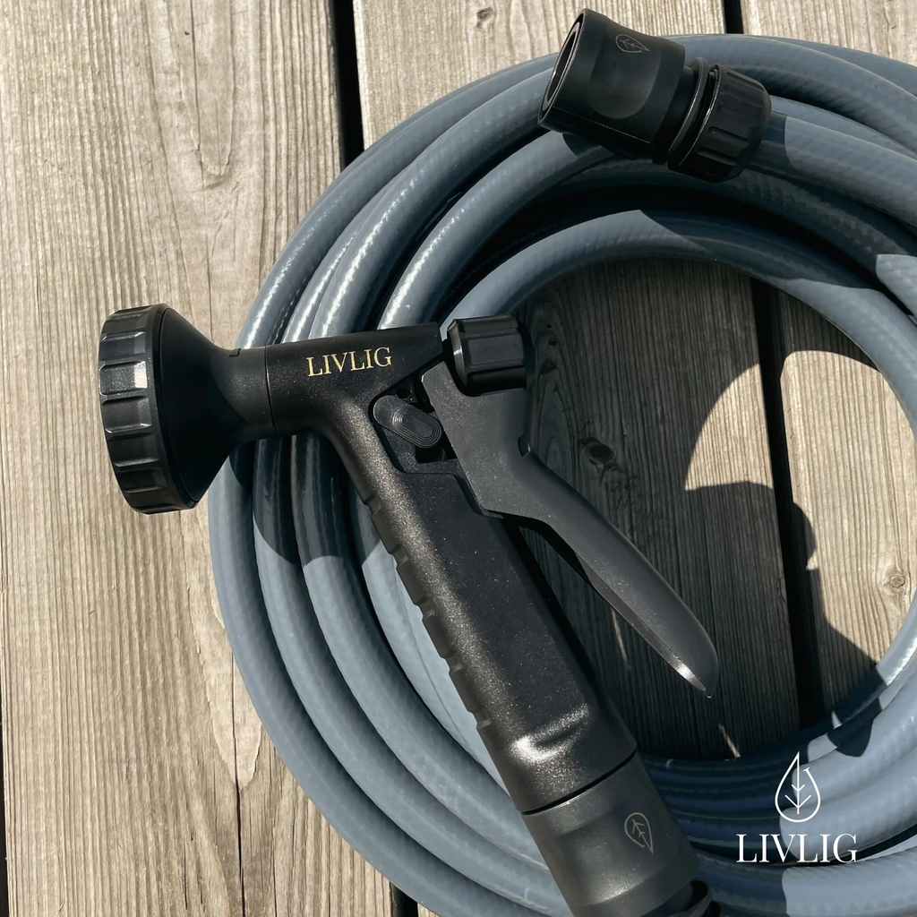 O Conjunto de Pistola de Rega Reciclada apresenta-se num preto moderno e é, por isso, ideal para quem valoriza um ambiente elegante também no jardim. O conjunto inclui não só uma pistola de rega, mas também elementos de ligação adicionais necessários para um início bem-sucedido da época de rega.