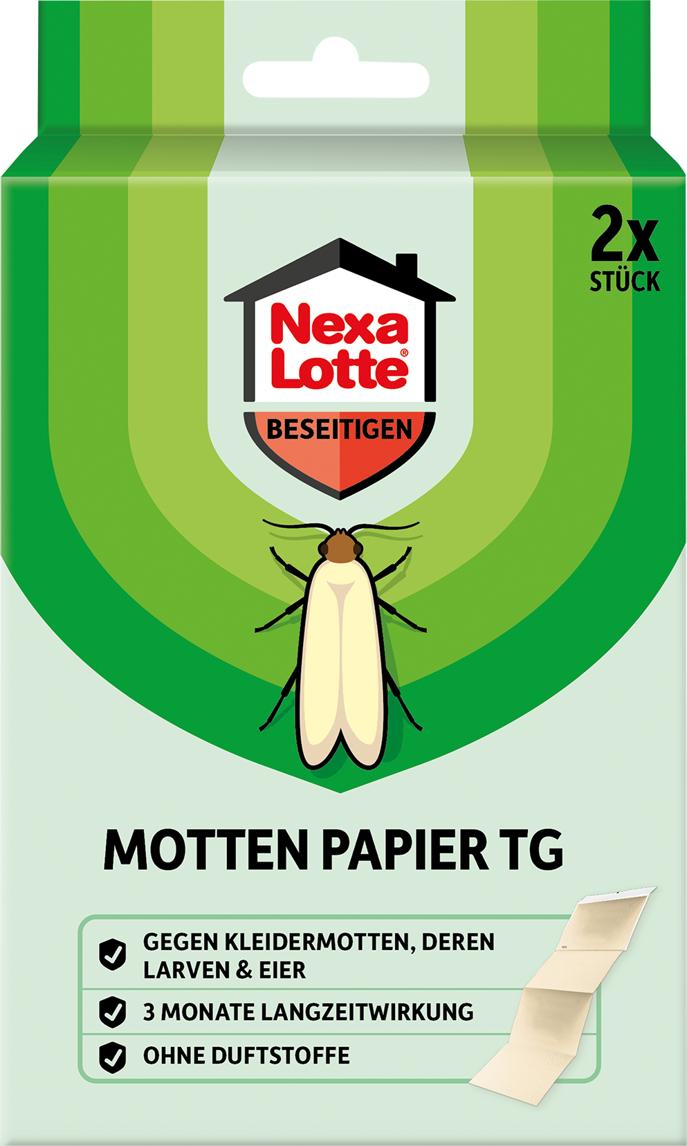 Ausgefranste Löcher im Lieblingsshirt? Das ist oft ein Zeichen für Mottenbefall. Kleidermotten legen bis zu 200 Eier – deshalb ist schnelles Handeln wichtig. Das geruchlose Motten-Papier von Nexa Lotte bekämpft zuverlässig Motten, ihre Larven und Eier sowie auch die Larven des Teppichkäfers.