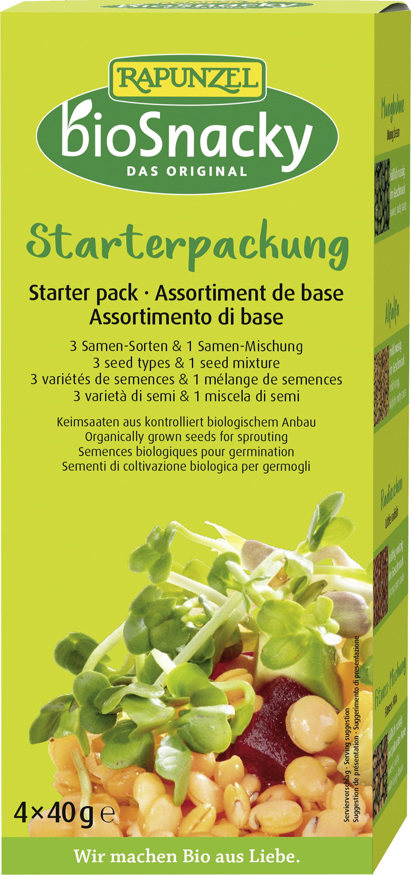 Com o Pack Inicial, recebe sementes de germinação populares que pode cultivar facilmente em casa, no parapeito da janela ou num germinador. A embalagem contém três variedades individuais de sementes e uma mistura de sementes: